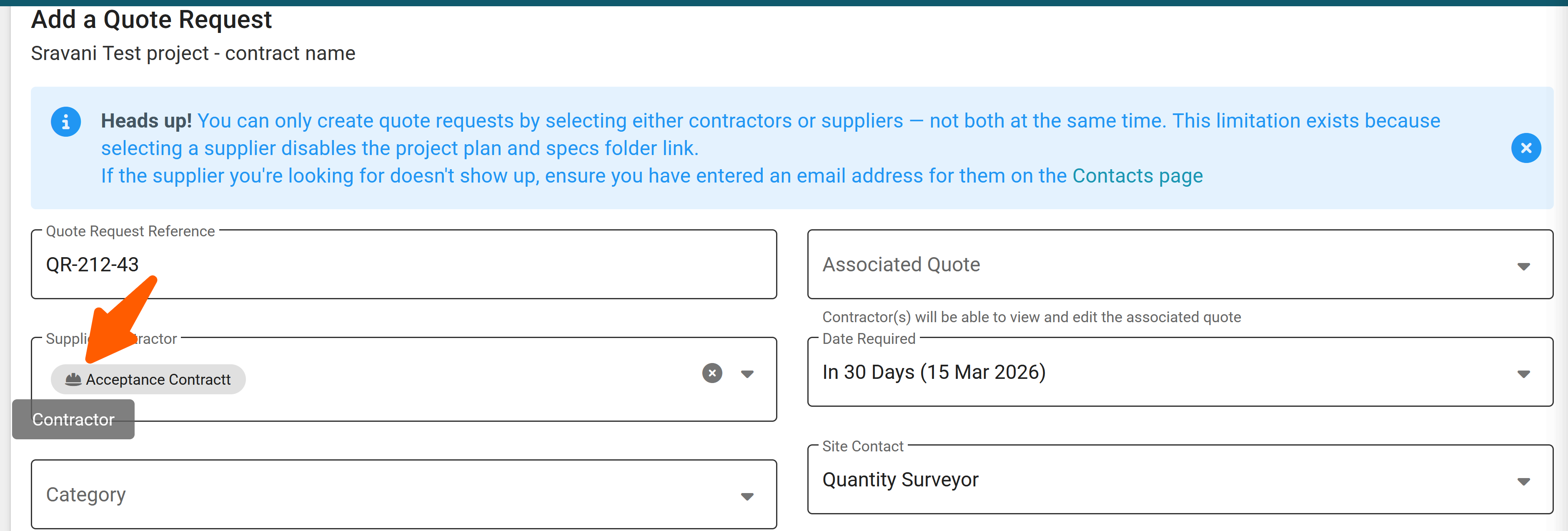 Select the person the supplier/contractor should contact with any questions via the Site Contact dropdown — this could be the Quantity Surveyor if selected on the project, The Project Manager, Client, Tenant, or you can free type in an alternative contact.