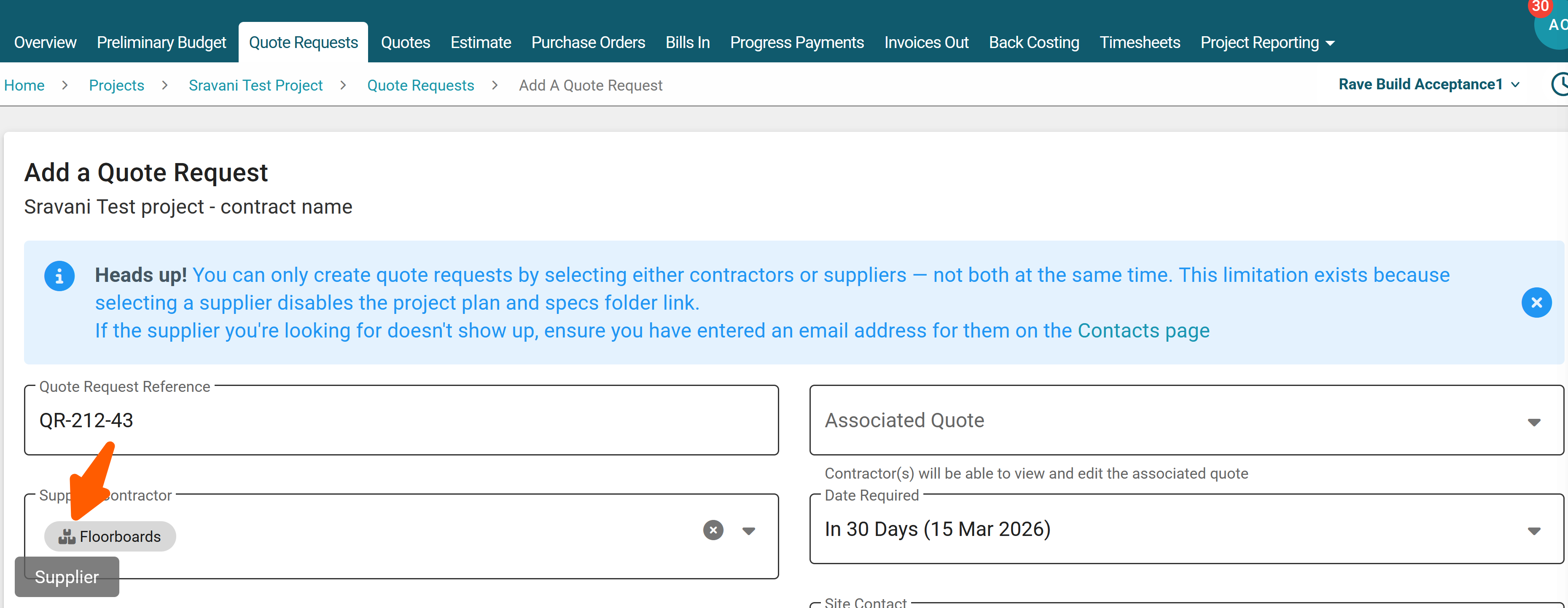Choose the relevant Supplier (or a Contractor with a RAVE login who has already been added to the People tab of this project) from the Supplier/Contractor dropdown menu.