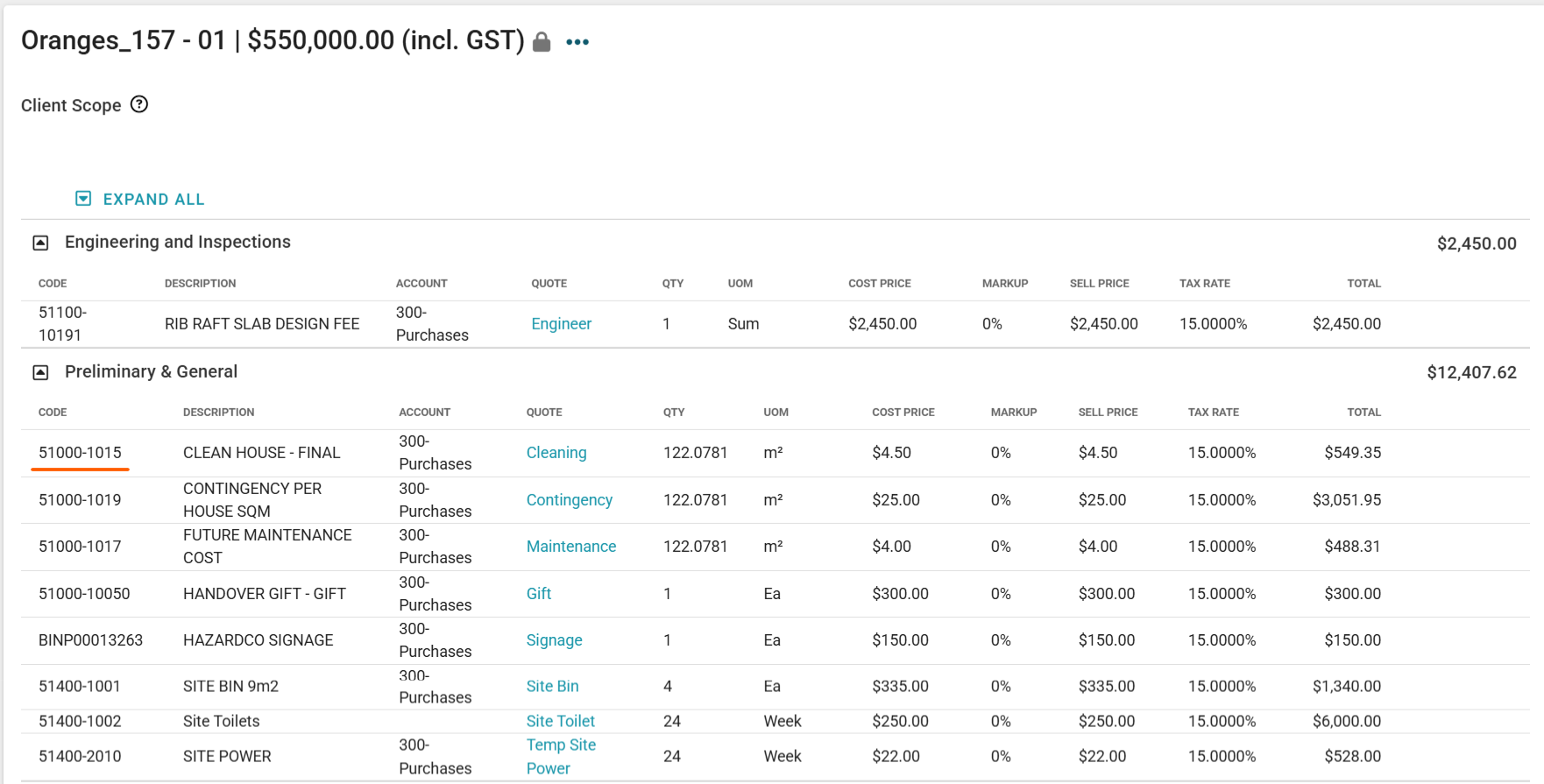 - The Raw Cost - the cost of all of your quotes in your estimate, excluding GST and all markup