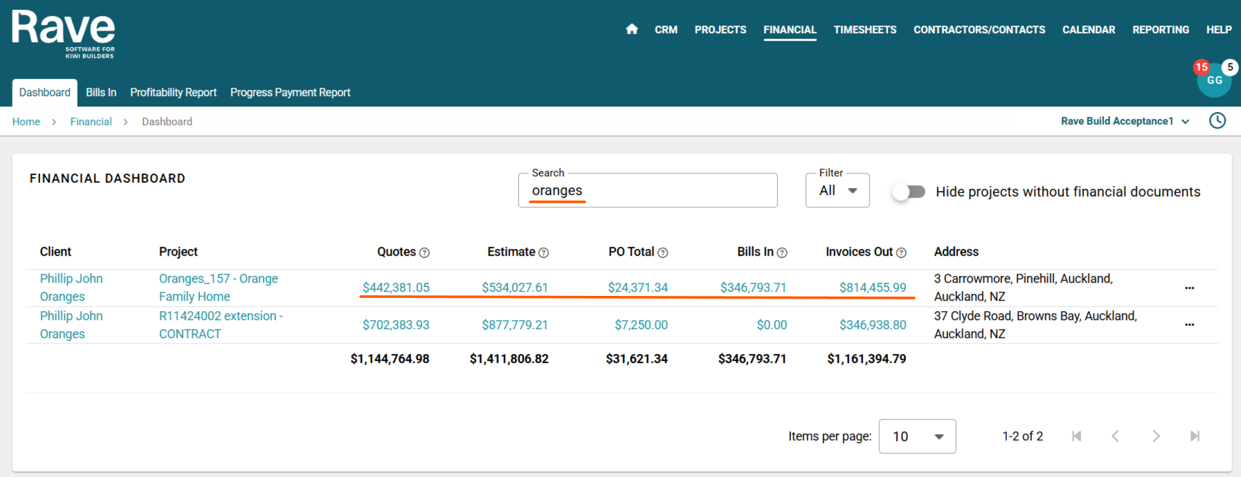 This method is useful when you want to quickly locate financial information without navigating through the full project list