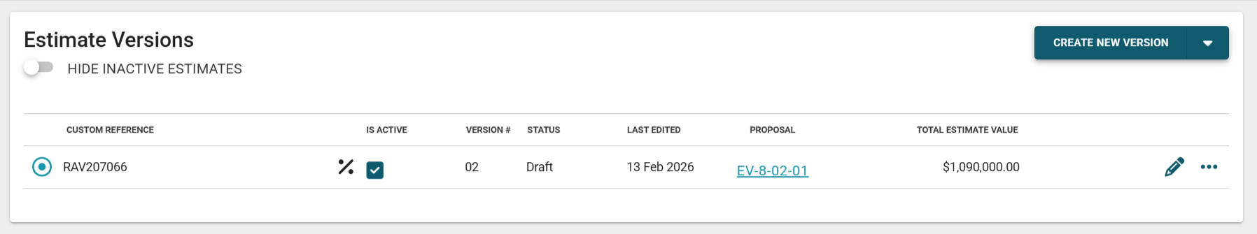 The version selected in this section determines which estimate proposal and pricing you are editing. Once selected, all other sections on the page will automatically update to display the details for that specific estimate.