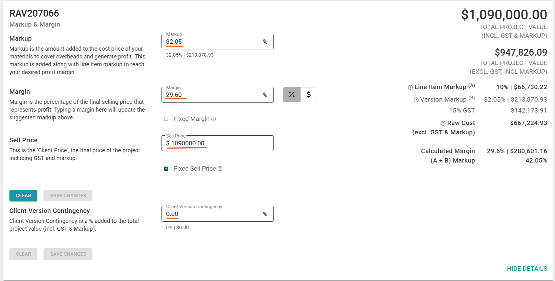 - Show Markup Breakdown – located below the Total Cost (inc GST & Markup)