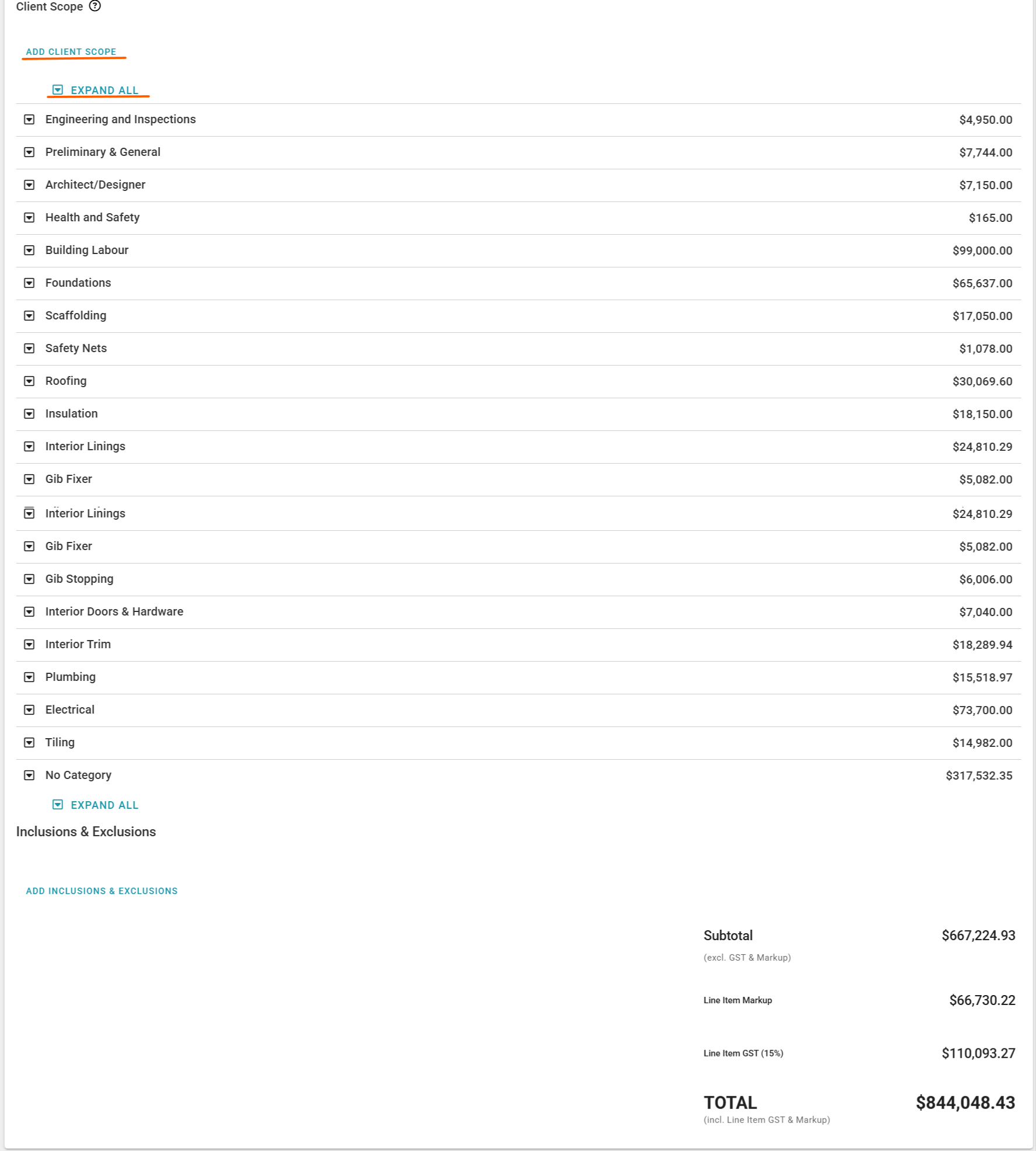 The full project value to the client including GST and all markup.Line Item Markup (A)
