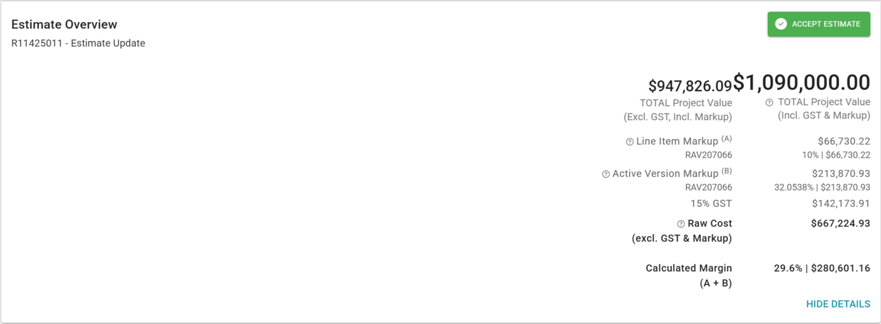 The total markup applied from the Markup & Margin section for the selected Estimate Version.GST Amount