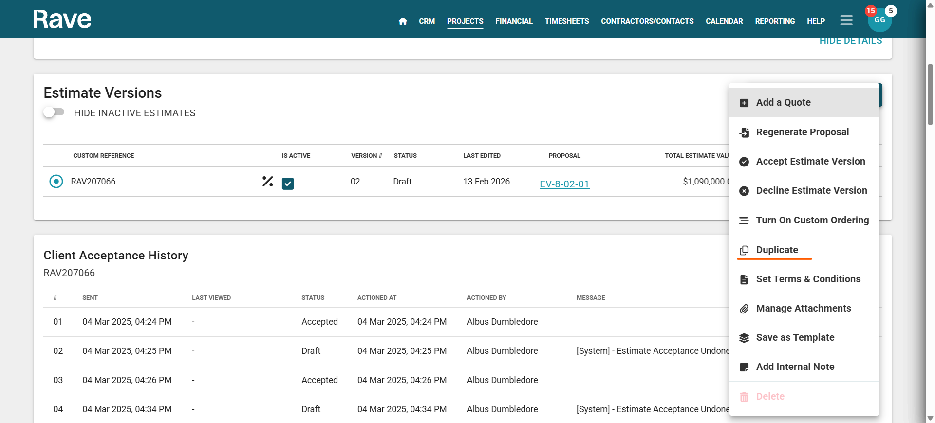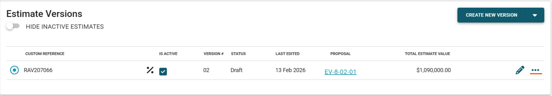 - Click the three-dot action menu next to the Estimate Version you want to duplicate.