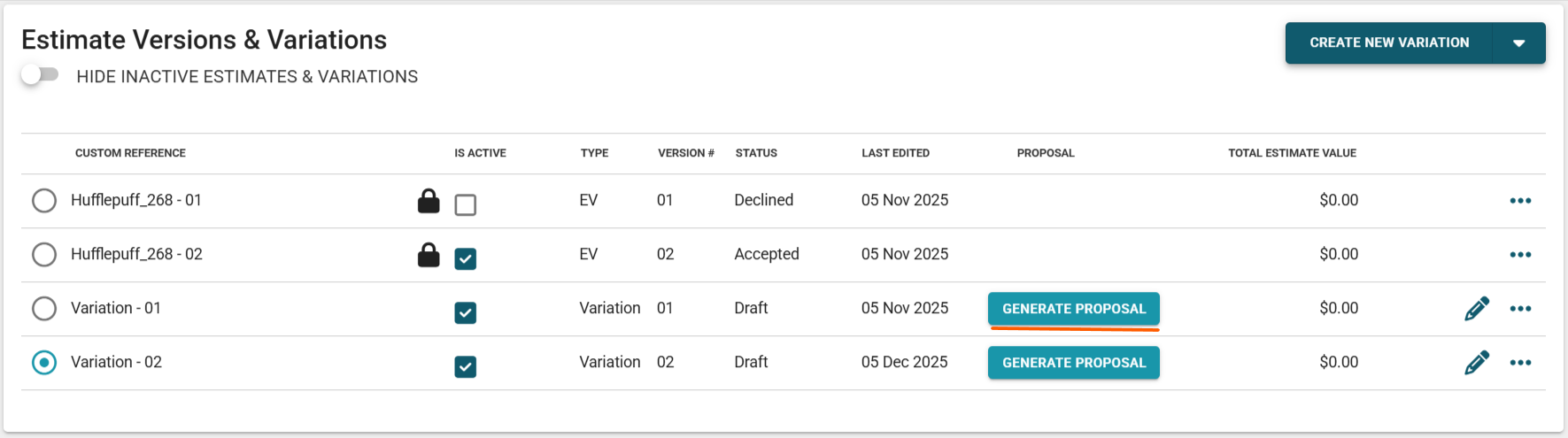 Selecting this button confirms the proposal. Once accepted, any further changes made will be created as variations to the original proposal.
