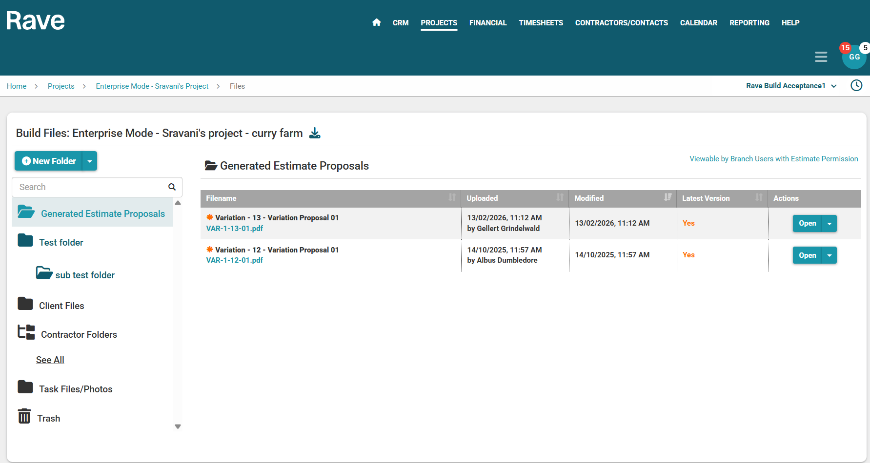 Your Estimate Proposals file will stay stored there until you (or your team) replace it with a new one. Every time you send or generate a proposal, RAVE will save it for you and store it here, so you don’t have to worry that you might lose these files. We will also check the latest version box if you update that proposal and re-download or send it to the client with changes.