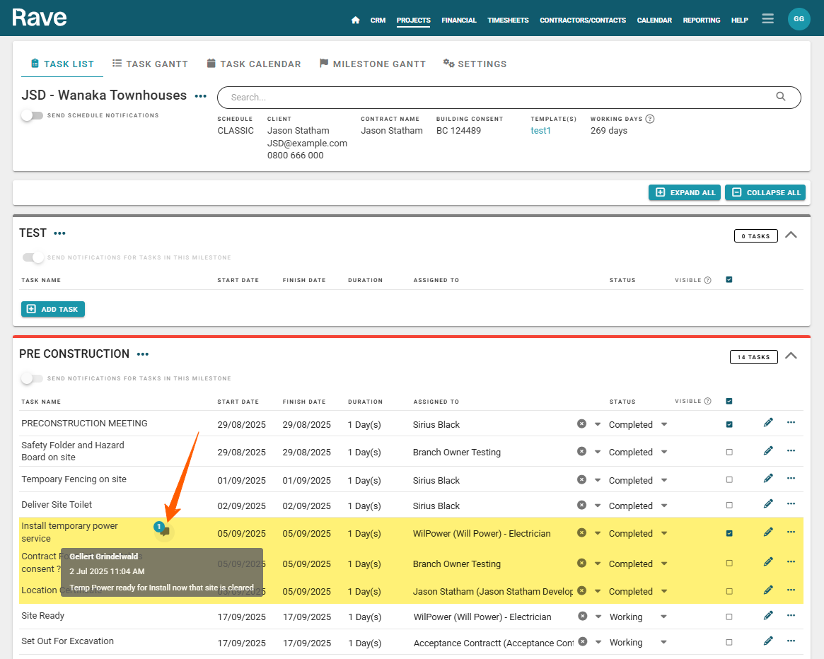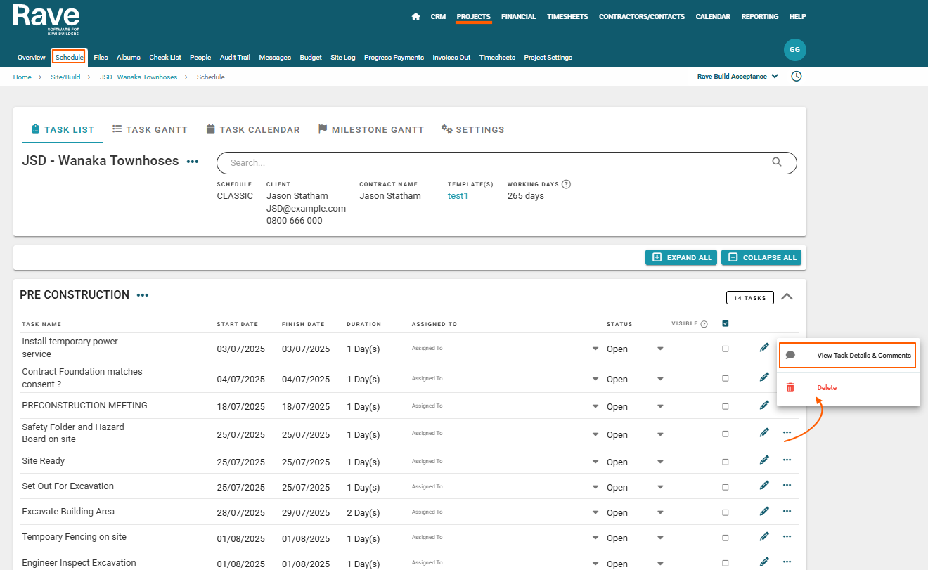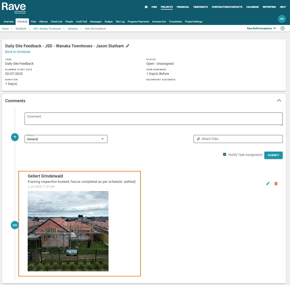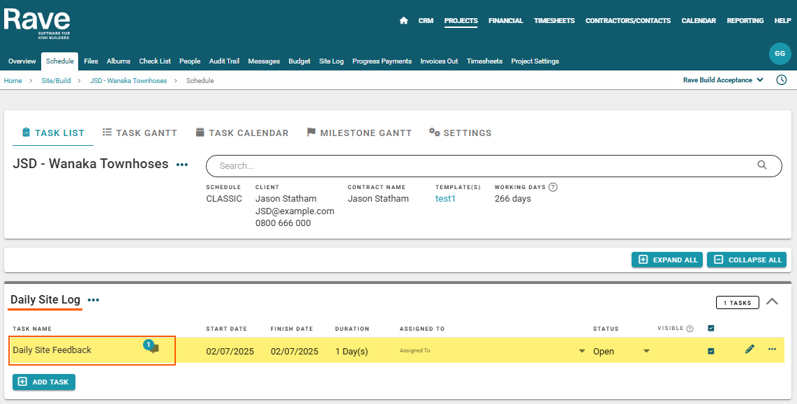 And that’s it! You can now catch up with your site manager, show them the ‘daily site log’ task you’ve assigned to them in your schedule, and let them know that you’d like them to add a comment (and photo(s) if appropriate) via our free to download RAVEBUILD app, at the end of each day to let you know what has happened on site.