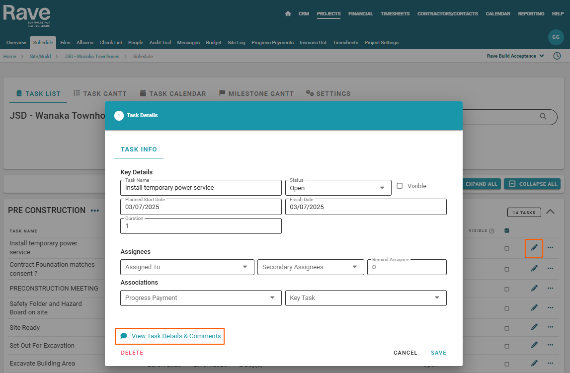 - OR from the Task Gantt view via the Task Details pop-up, and selecting ‘View Task Details & Comments’