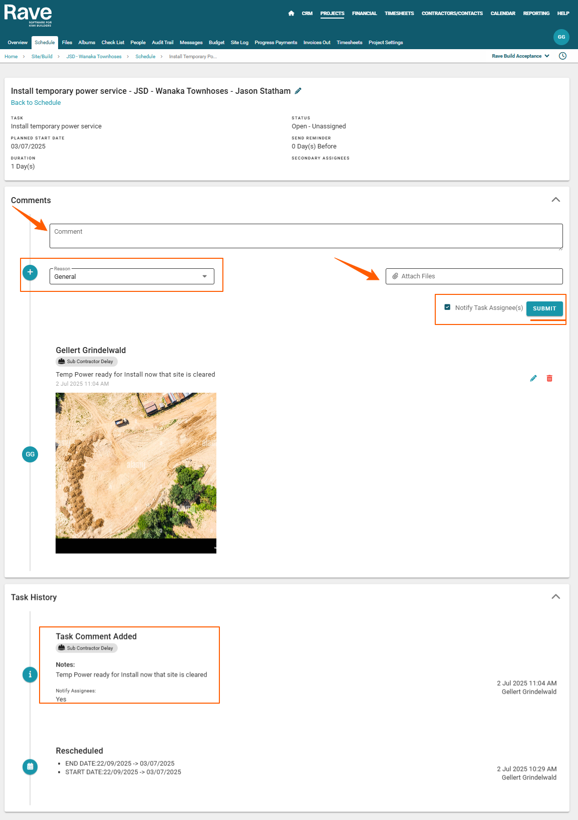 If the ‘Notify Task Assignees’ check box was ticked, the contractor would receive an immediate alert from RAVE that there is a new comment added to their assigned task – they also have the opportunity to comment (send a response back to the project manager and all other task assignees) also with the option of adding any photo’s or documentation too.