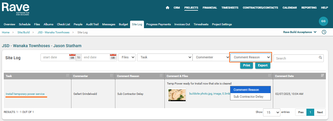 All task comments are also recorded in the project’s ‘Site Log’ sub-tab – allowing you to quickly scan all of the comments, photos and documents added to tasks in your project. Plus some handy filtering tools, and a search field, to quickly find delays across your jobt. As per the screenshot below – the table displaying these includes: