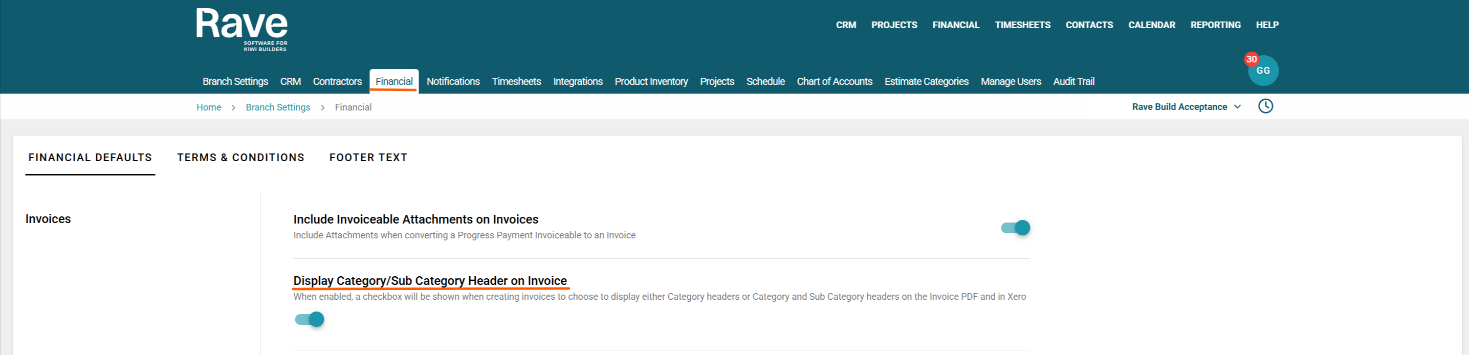 Under Branch Settings - Financial, there is a slider that lets you enable the Category Header or Category and Subcategory header on the invoice.