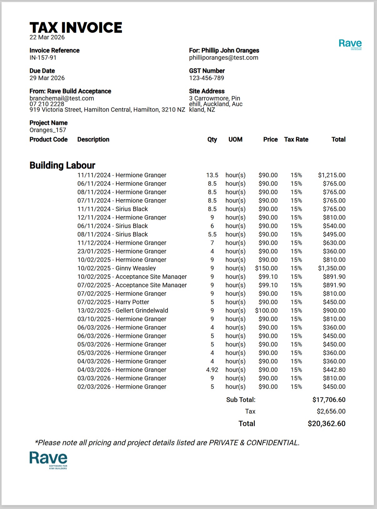 Rave Invoice PDF showing Time sheet Bill Consolidated by User/Date, and then with the Category Header displaying