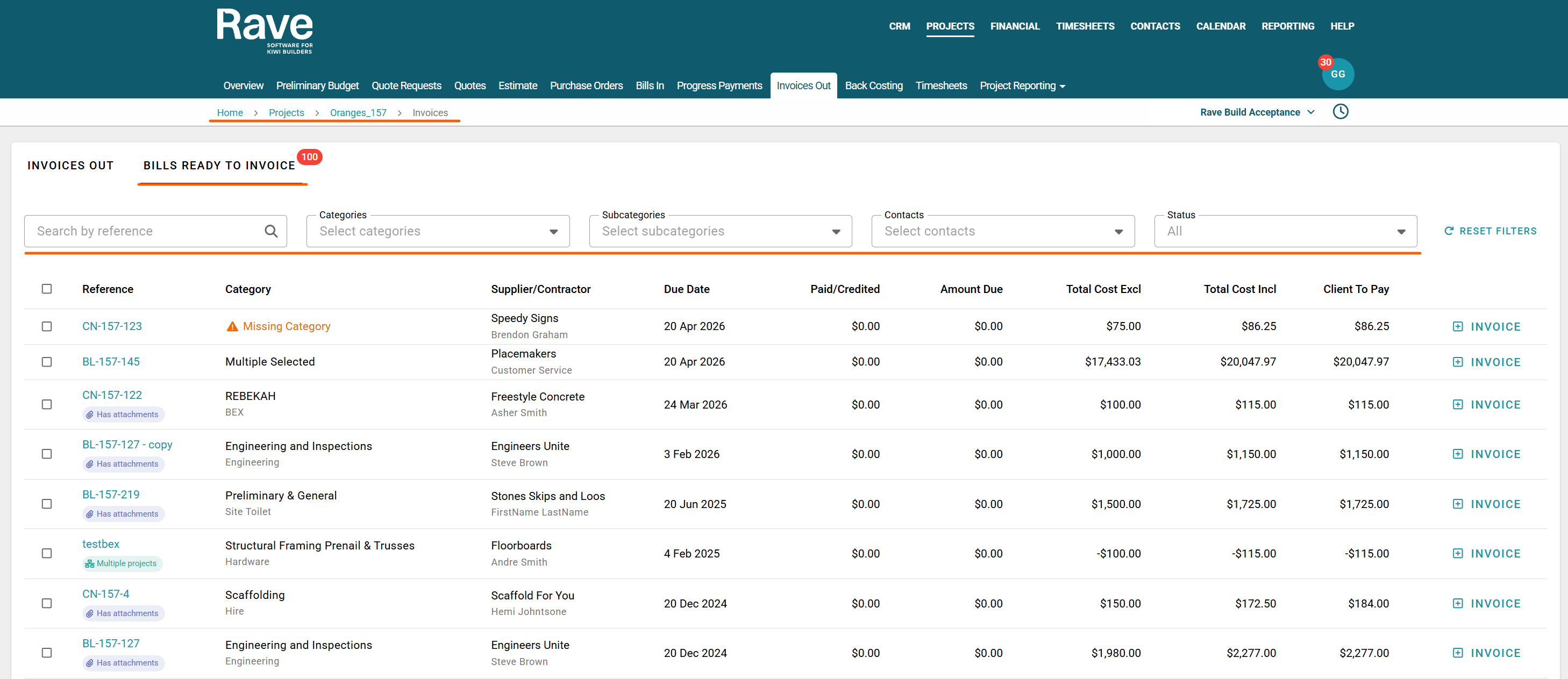 You can access your Project’s financial workflows from either the Financial button or the Project button's Project list, clicking on the project’s reference number, and finally selecting the Budget sub-tab, then Invoices.