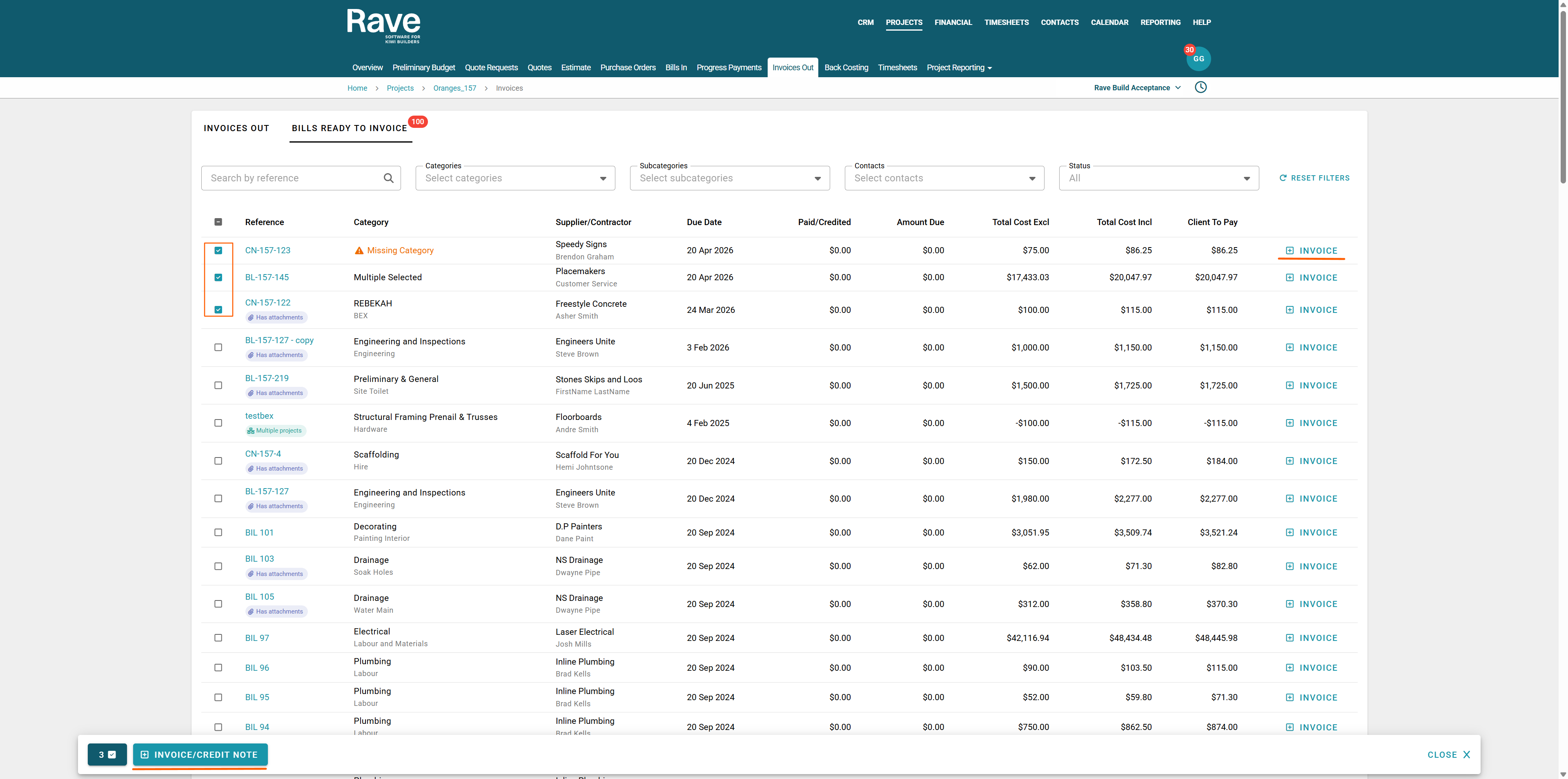 To create the client invoice, you can either click the + Invoice button to the right of the relevant bill or credit note, or you can select multiple bills/credit notes by using the square icon to the left of the reference and then, when the bulk action bar appears, select + Invoice/Credit Note