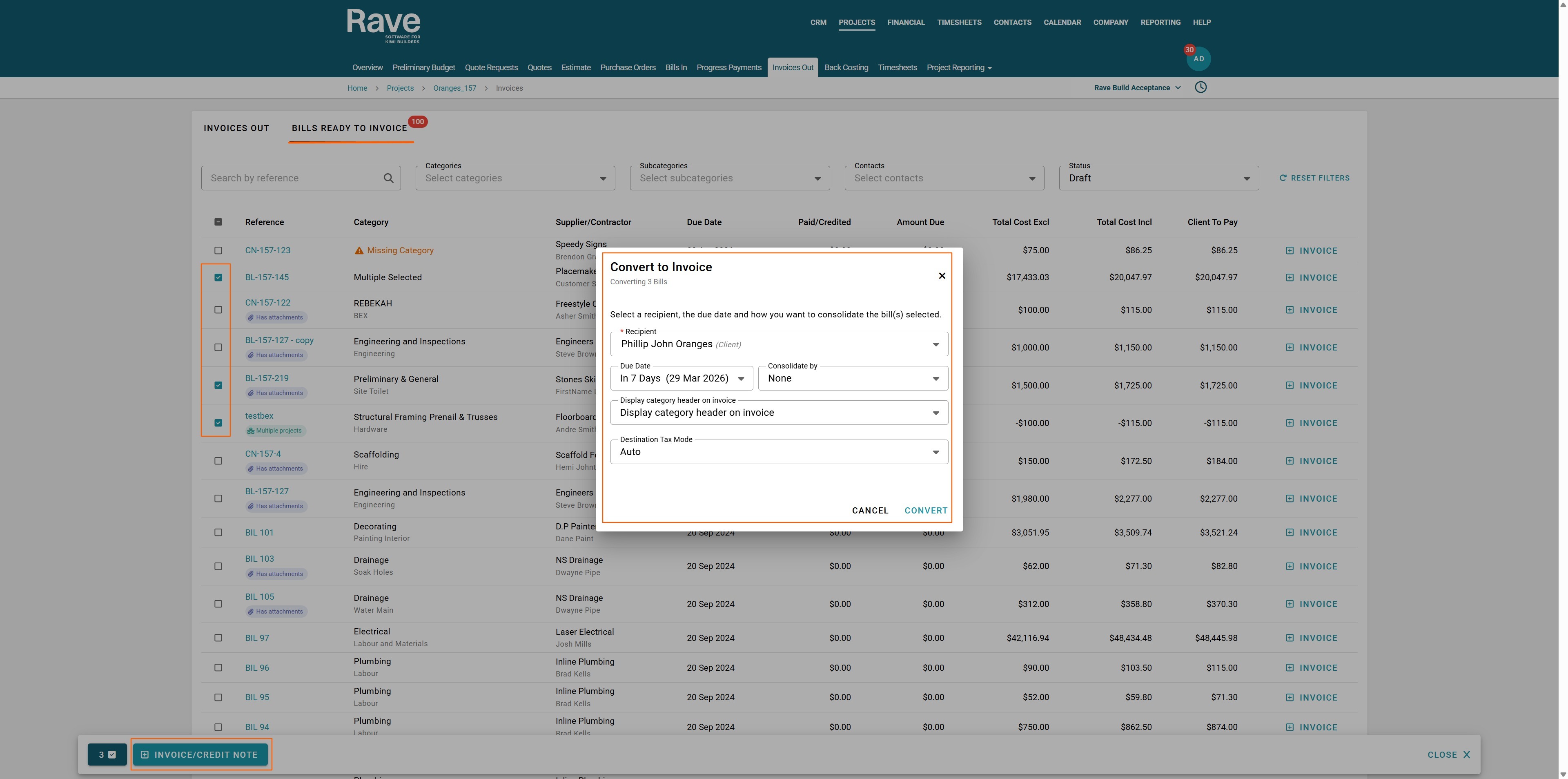 If the value of your credit notes is greater than the value of your bills, Rave will automatically create a client credit note. If the value of your bills is higher, Rave will create an invoice.