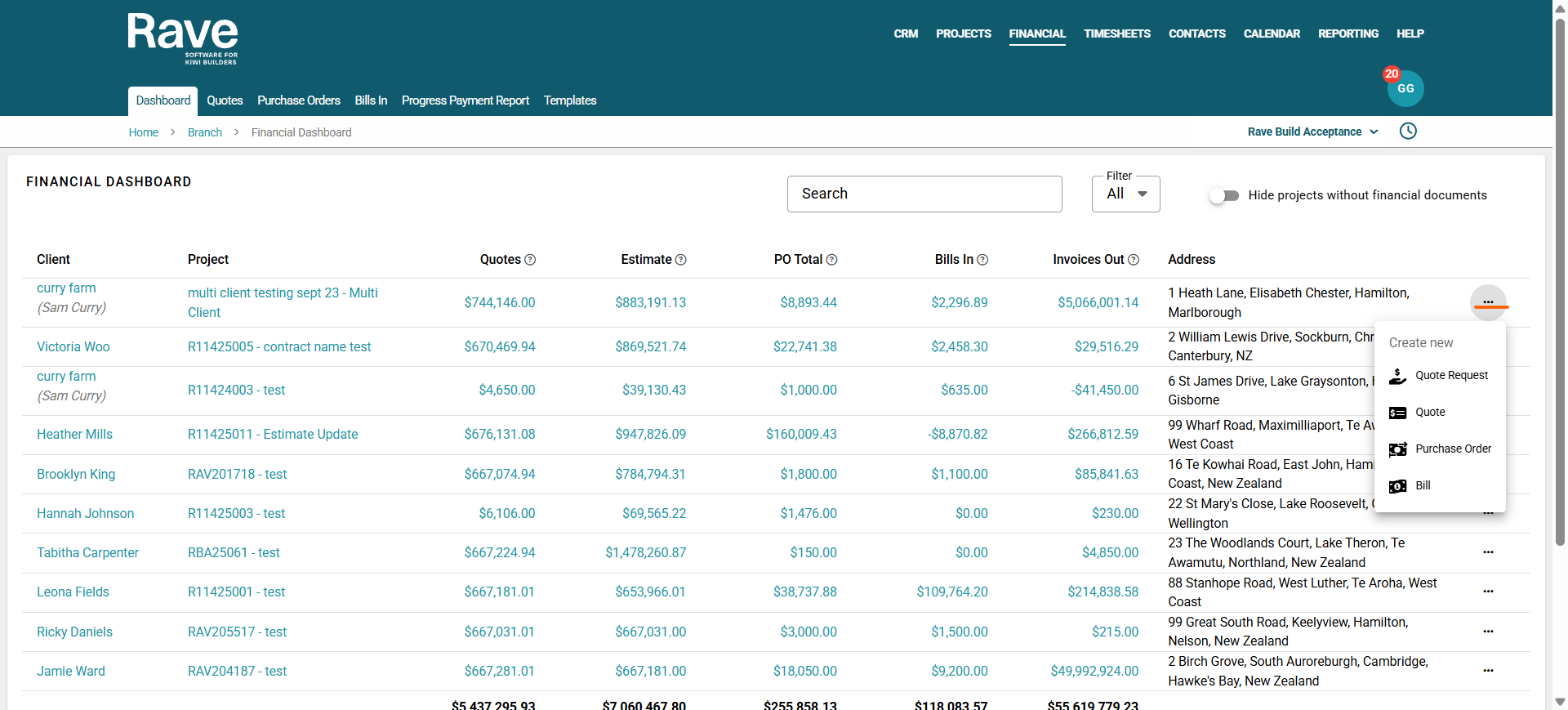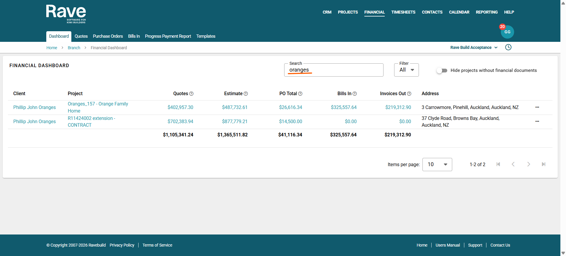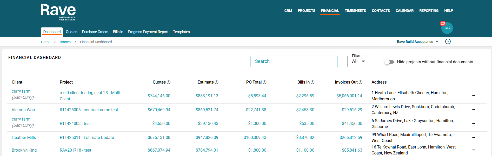 On the top right-hand side, there is a Search, Project Status Filter along with a convenient slider that hides all projects without any financial documents attached. When enabled, this slider removes all projects that do not have at least one of the following documents: Quote, Estimate, Purchase Order, Bill, Invoice, or Credit Note.