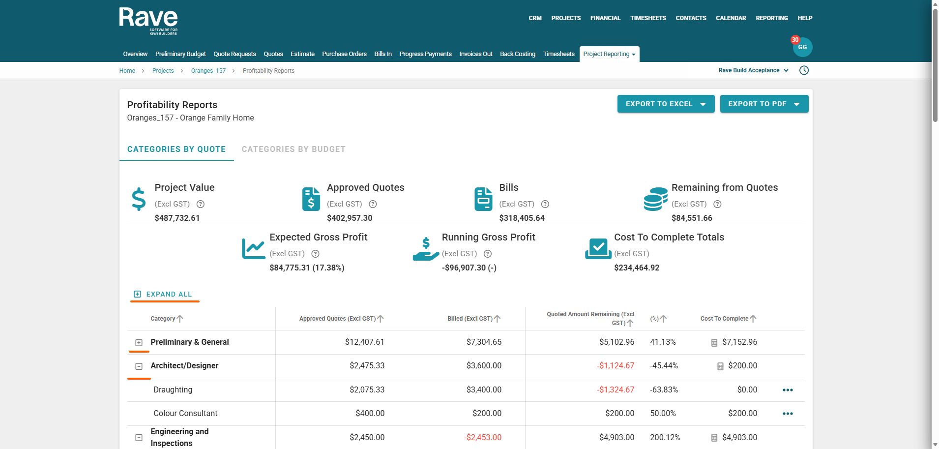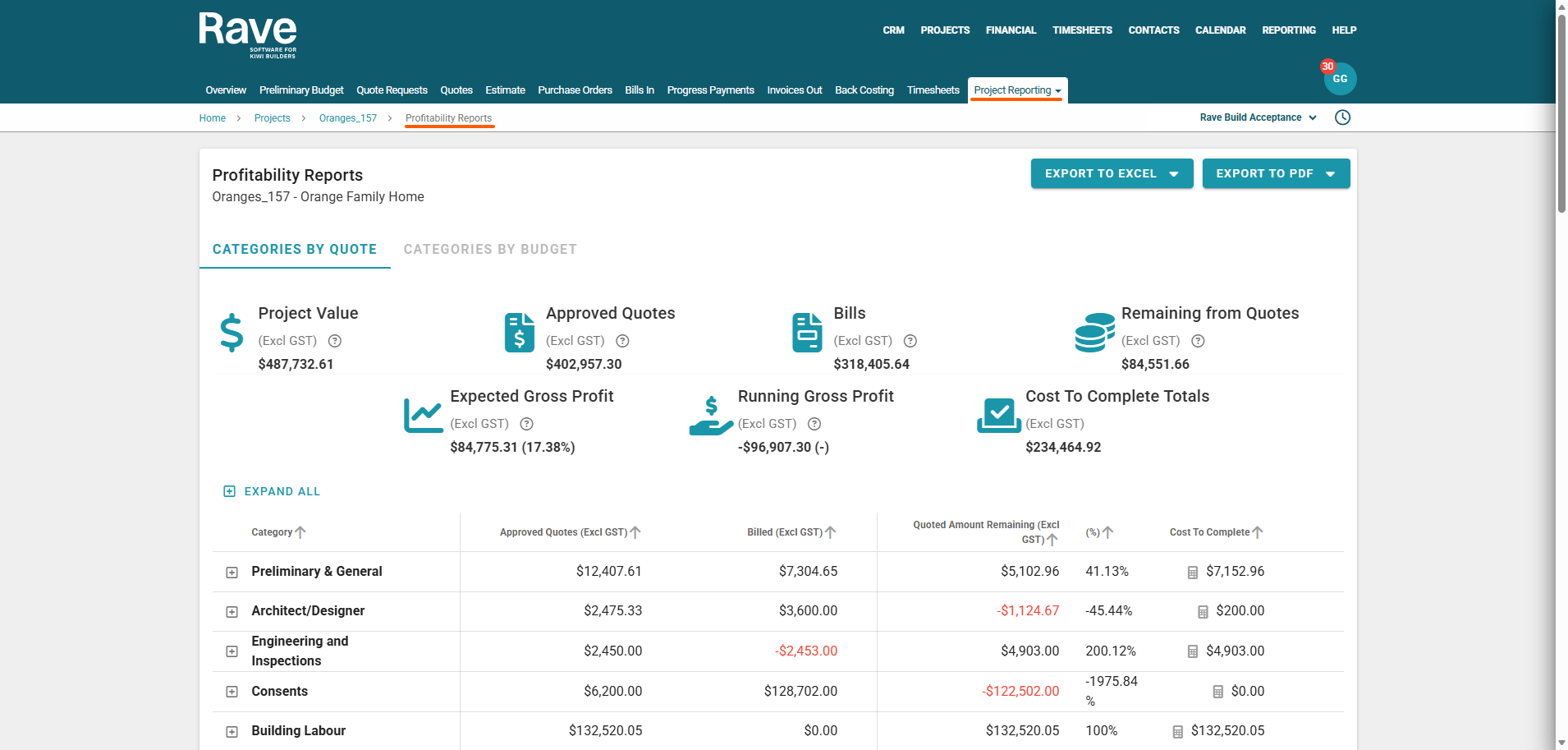Monitor profitability — by comparing your Expected Gross Profit (what you planned to make) against your Running Gross Profit (what you’re actually making right now).