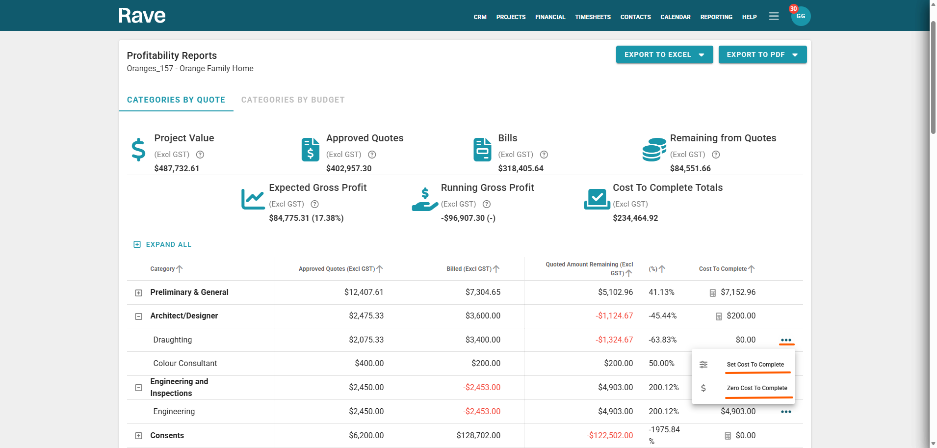 The Cost to Complete column (located on the right-hand side of the report) shows the remaining cost required to finish the project. It calculates this by taking all of your Bills In, removing any overspend, and then providing the balance needed to complete the project.