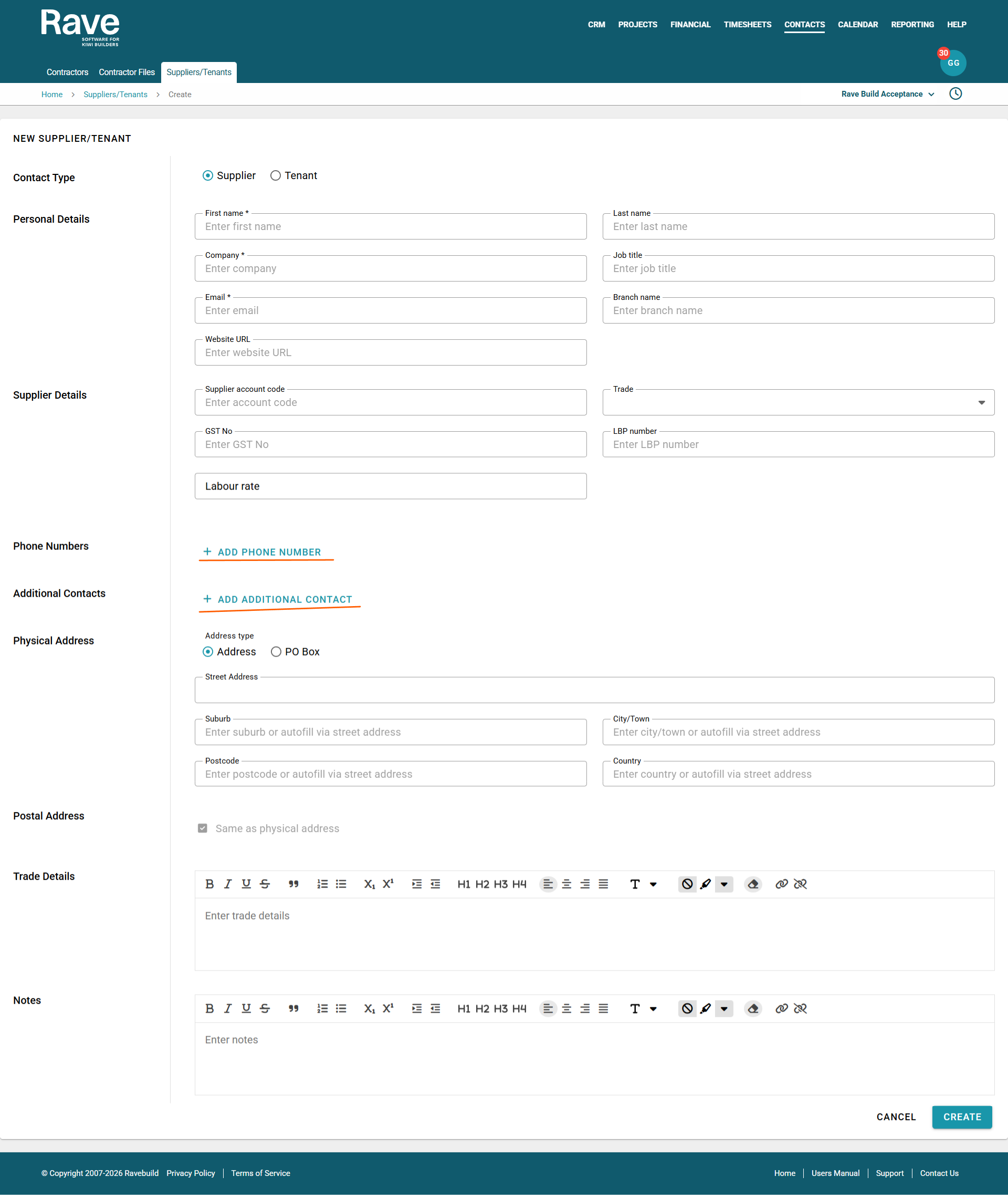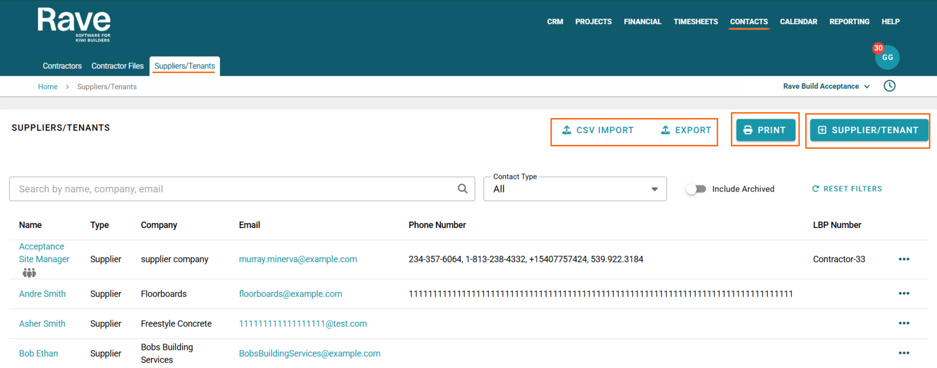 Noting that First Name, Company and Email are all mandatory for Suppliers, while only First Name is Mandatory for Tenant. We do suggest loading as much information as possible to ensure that when using these contacts in RAVE, it's easy to find the right one.