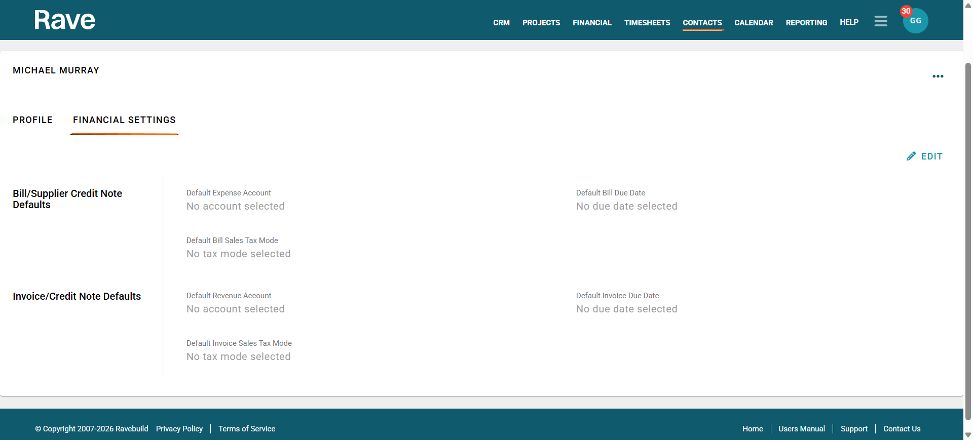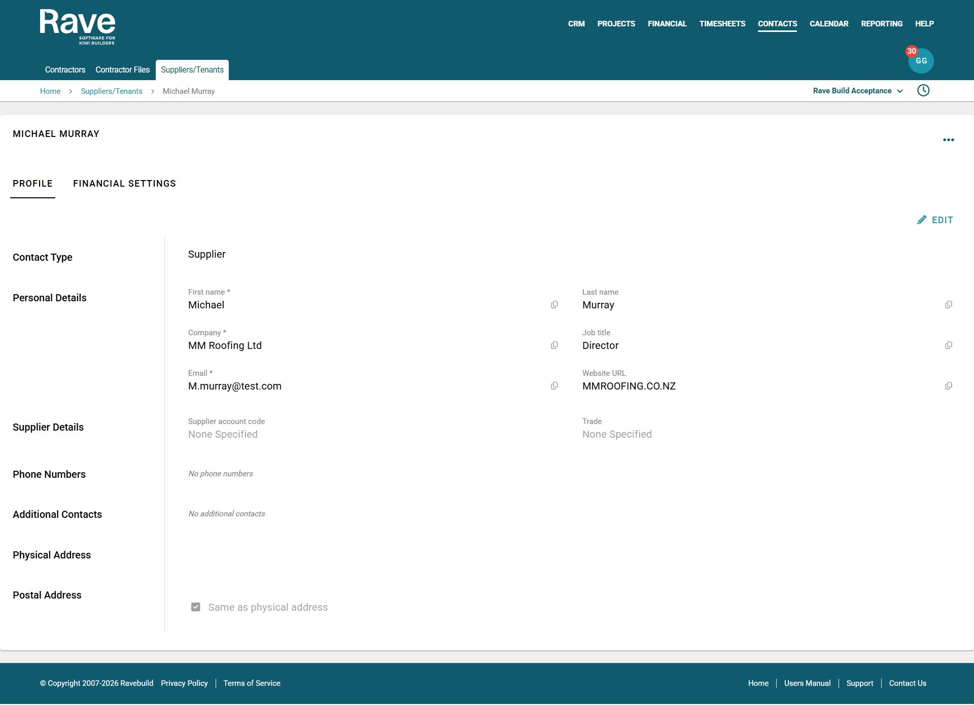 The Second Tab is Financial Settings. With edit permission, you can set Financial defaults for this Contractor, which will feed into our Financial Management System and, if connected, Xero.