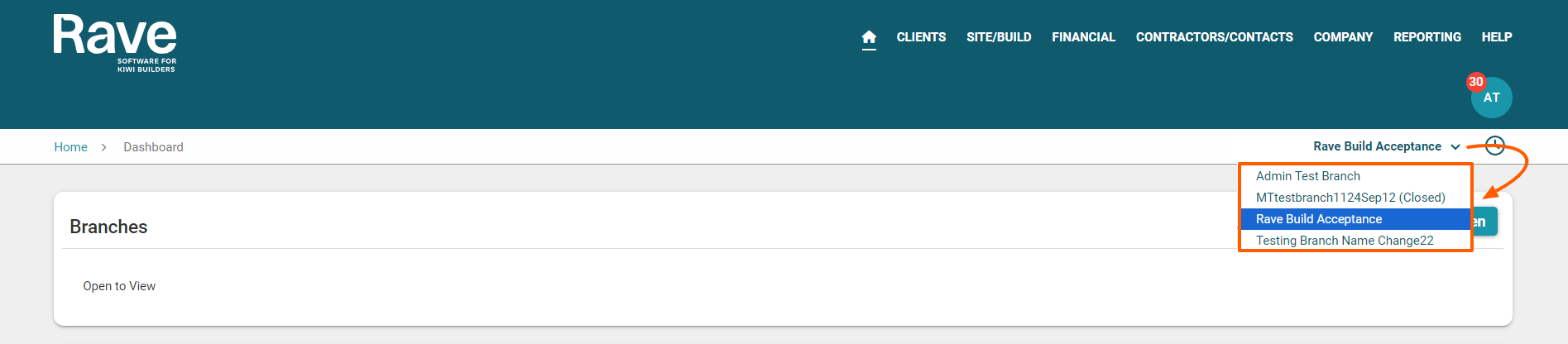 Locate the cross-branch dropdown at the top-right of your screen (just below your profile name).