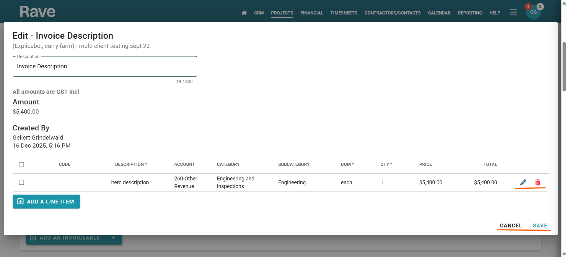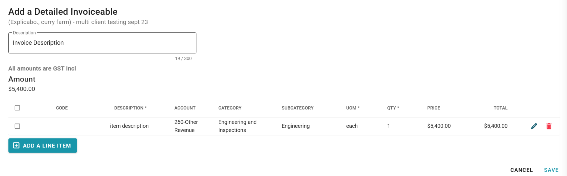 - You'll then have the option of adding another line to this invoiceable - via the 'Add a Line Item' button to the bottom left of the pop-up