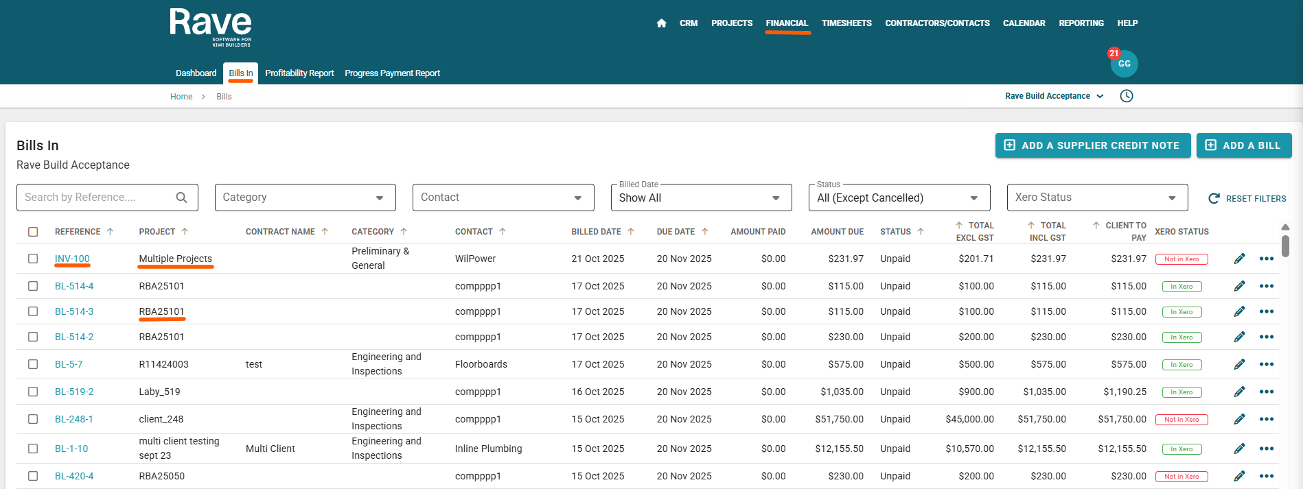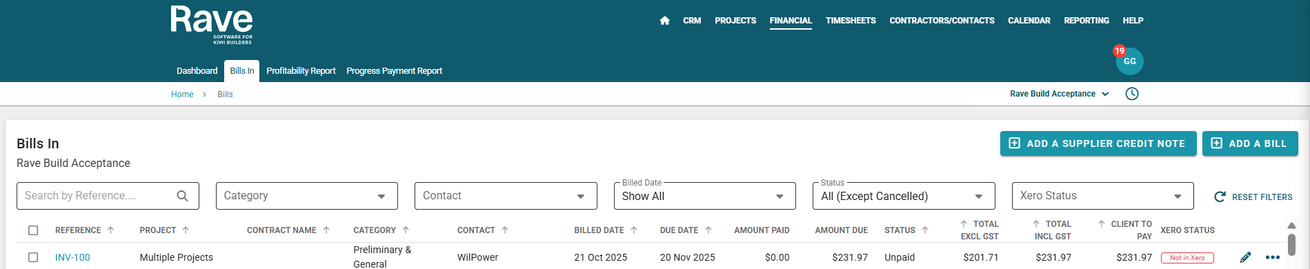 In simple terms, the Branch-Level Bill workflows let you load multi-project bills and credit notes from a single supplier into RAVE, then split the costs or credits across several jobs. For example, this works perfectly for handling a monthly power supply bill or a skip bin hire credit note that applies to multiple projects or sites.