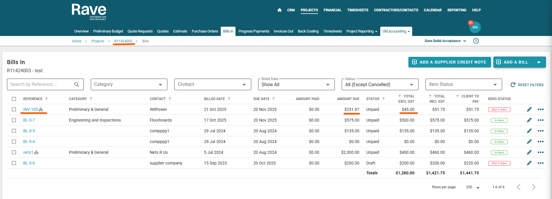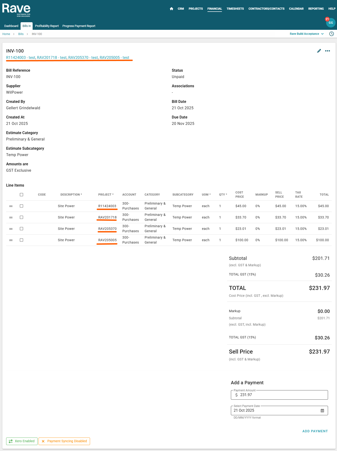 - In the example above, we can see a bill of $201.71+ GST has been charged to the above 4 projects. when clicking into Project R11424003 we can see that only $45 + gst has been allocated to this project on the bills screen.