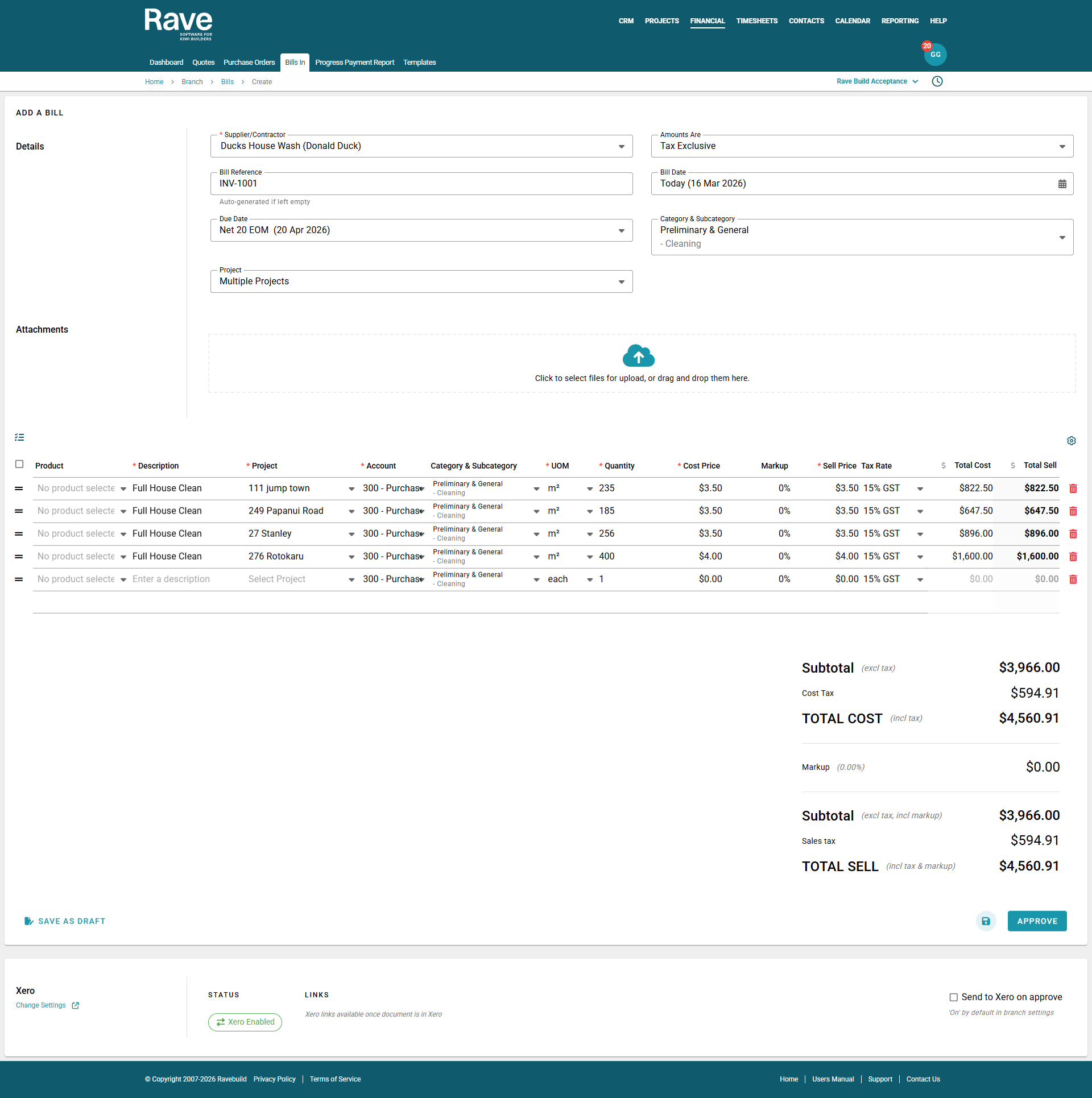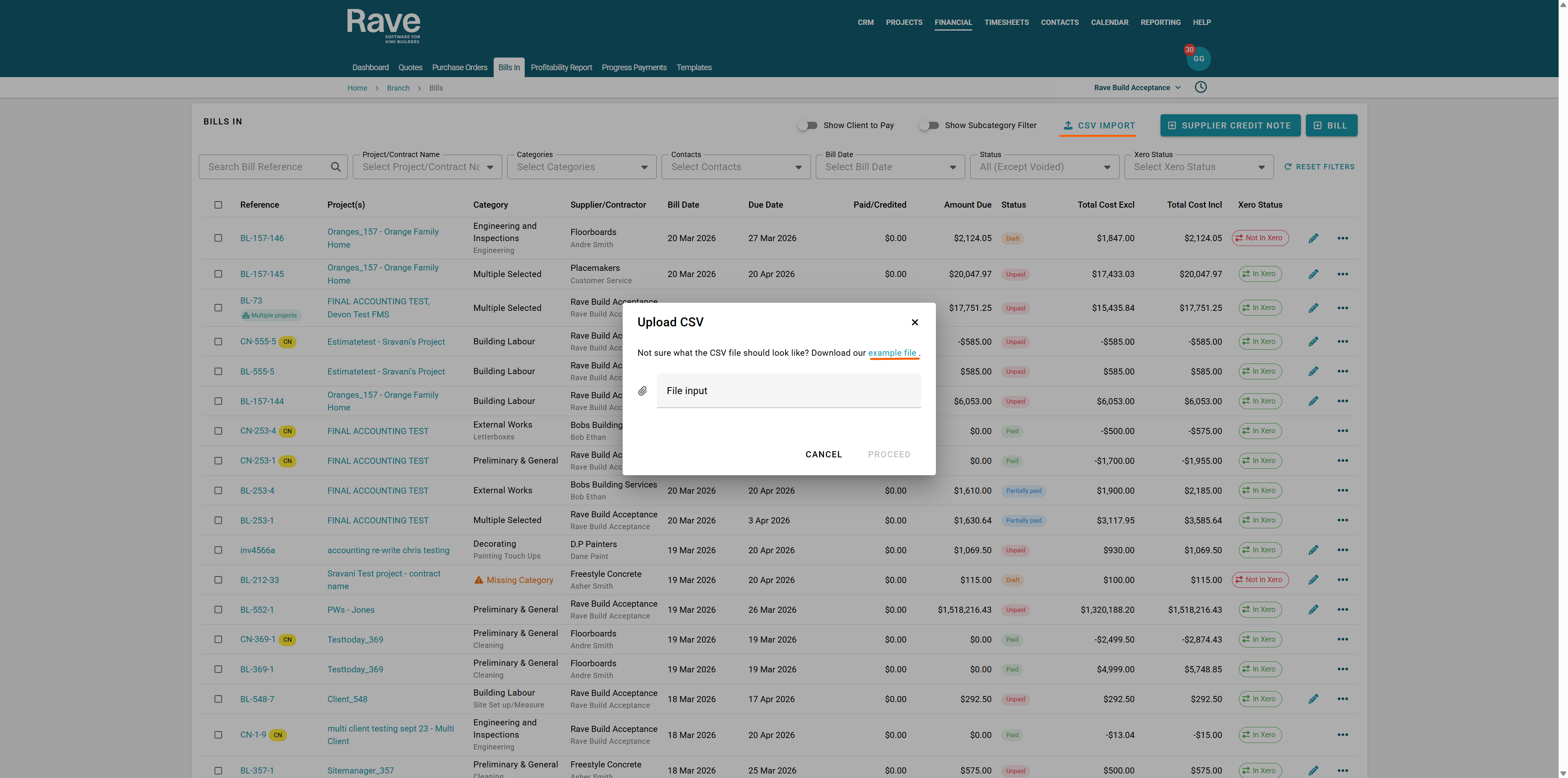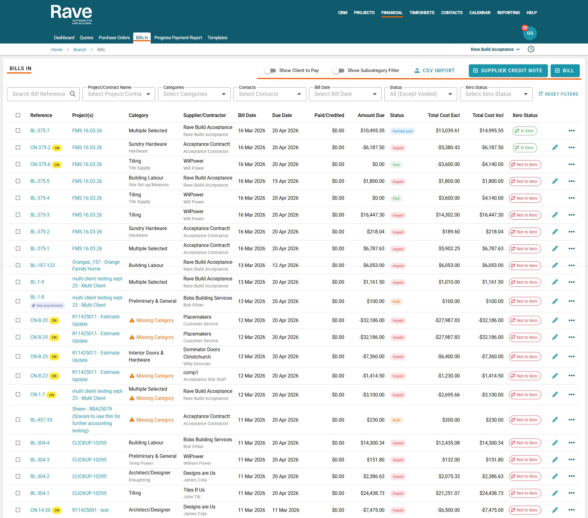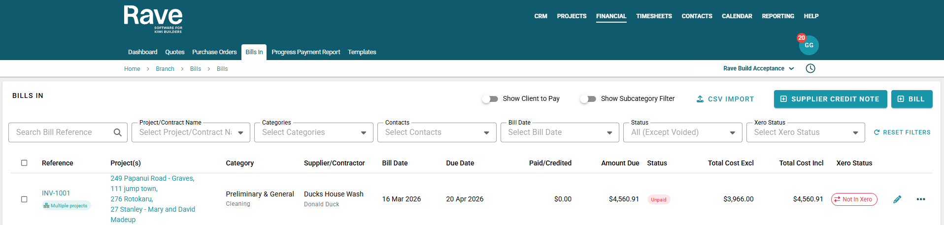 RAVE’s Financial Management System includes Branch-Level Financial Document Level options. This article will focus on Bills in and Credit notes. There is also a Quotes and Variation Quotes article here and a Purchase Orders article here