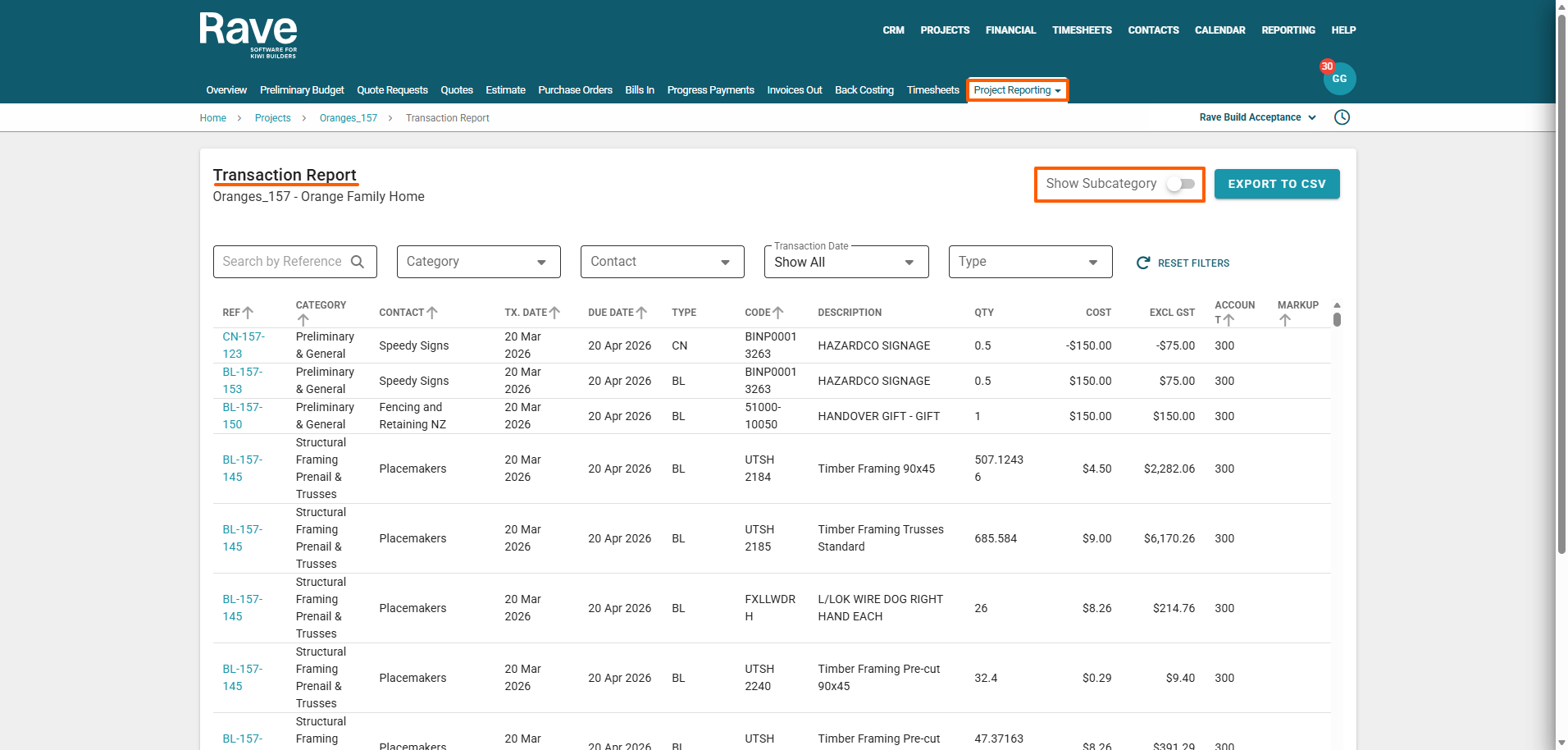 The RAVE Financial Management System's 'Transaction Report' allows you to easily view ALL of your project's Quotes, Variation Quotes, Purchase Orders, Bills, Supplier Credit Notes, Invoices and Client Credit note line items in one place. The transaction report displays the document reference, description, supplier, category (and subcategory if you choose to switch the switch on), quantity, line price, Chart of Account, and more - with simple search functionality and filters to help you quickly find the information you need.