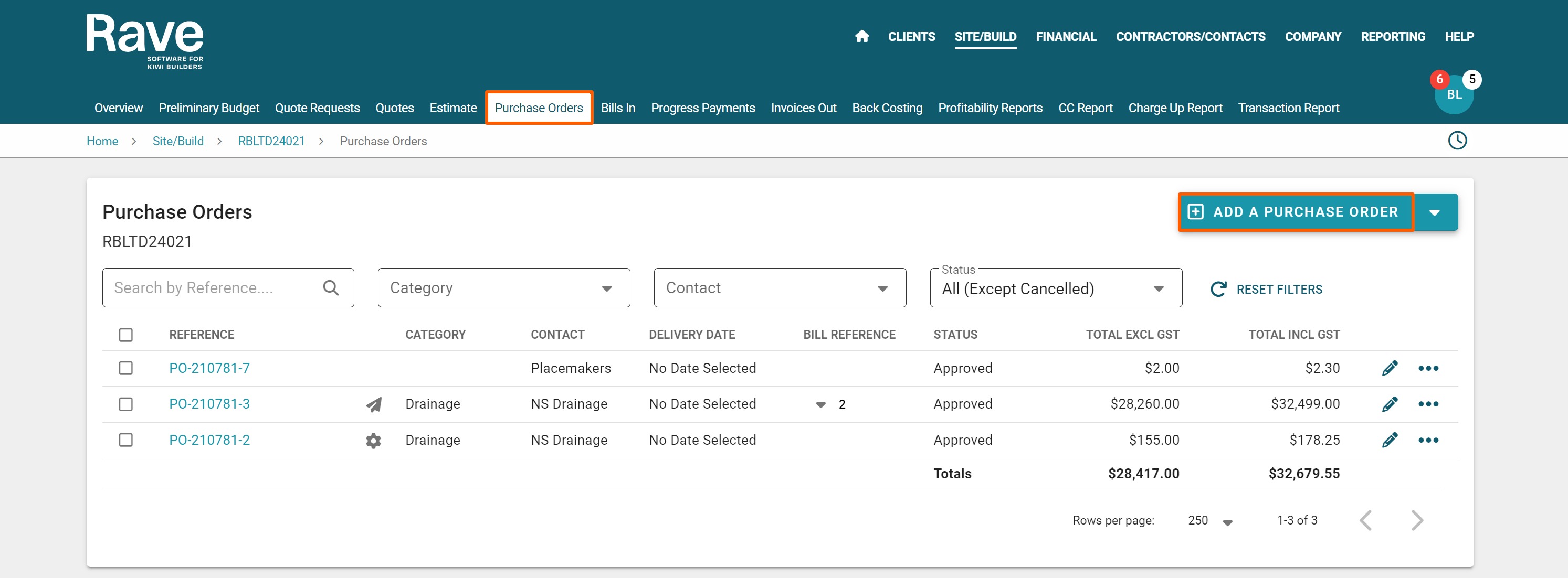 The Purchase Order sub-tab is where you create and manage all purchase orders for a project.