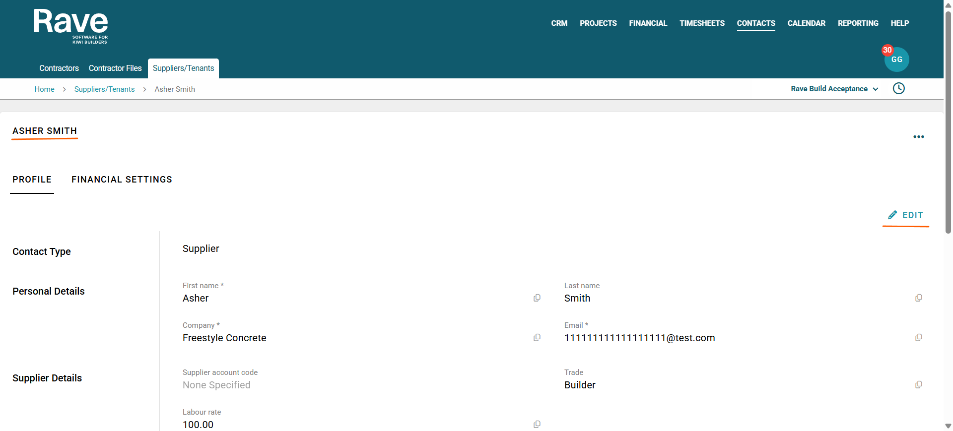 Once in the Suppliers/Tenants sub-tab, click the supplier profile you wish to edit using the teal hyperlink in the Name Column. This will open the Supplier Profile, where you can then click Edit and make your changes. Make sure to press Save once done.
