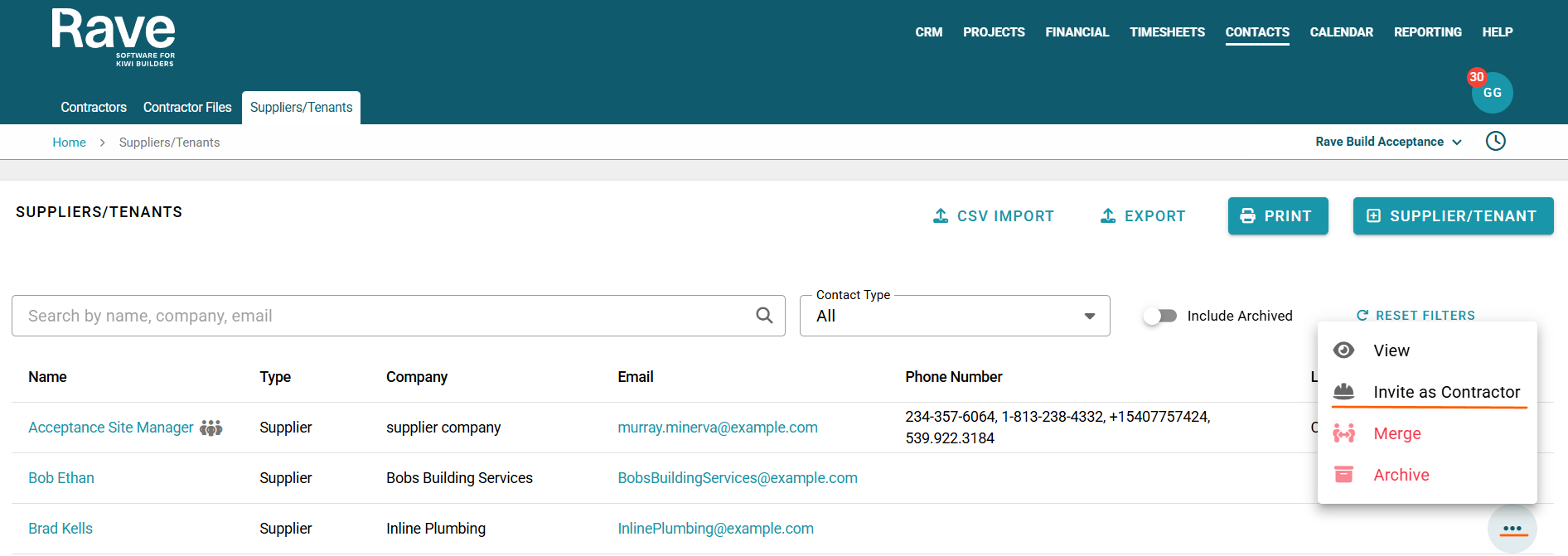 As opposed to 'Contractors' who do need a RAVE login to access your projects, schedules, and documents in RAVE, they can also view quote requests in RAVE, submit a quote, and view Purchase Orders. As a result, we send a welcome email with login details to 'Contractors', but we don't for 'Suppliers'