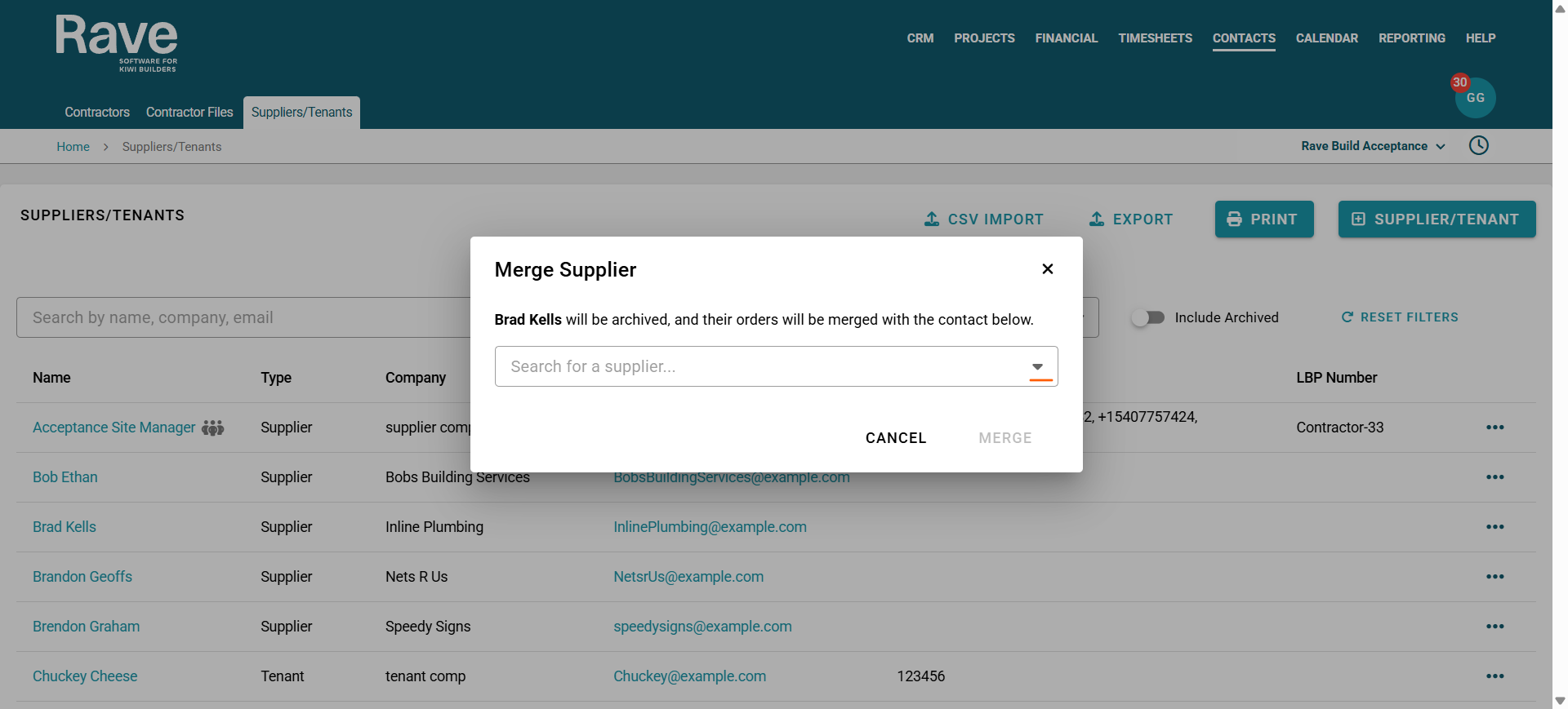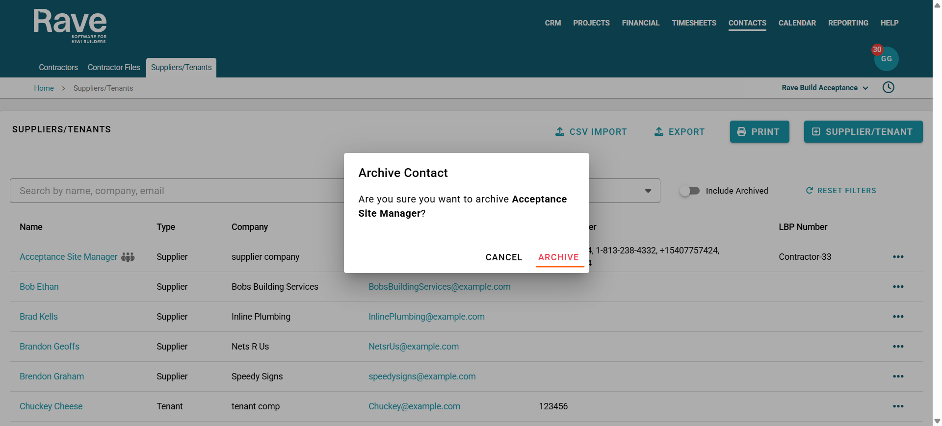 This article will focus on editing/managing and archiving Suppliers and, where applicable, Tenants.