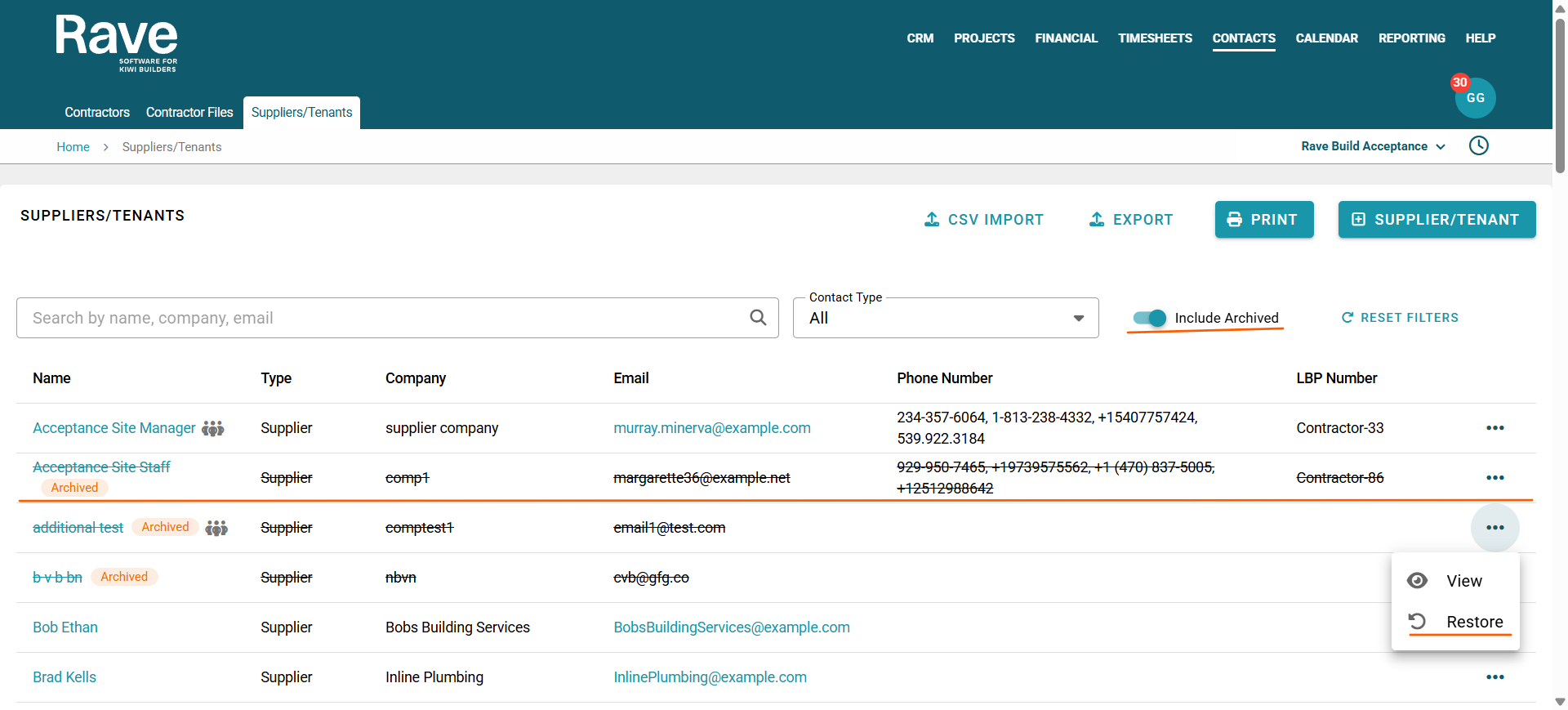 If you archive a supplier or Tenant and want to bring them back. Slide on the Include archived toggle. Find the archived supplier. Click on the 3-dot ellipse and select Restore. This will bring the supplier back.