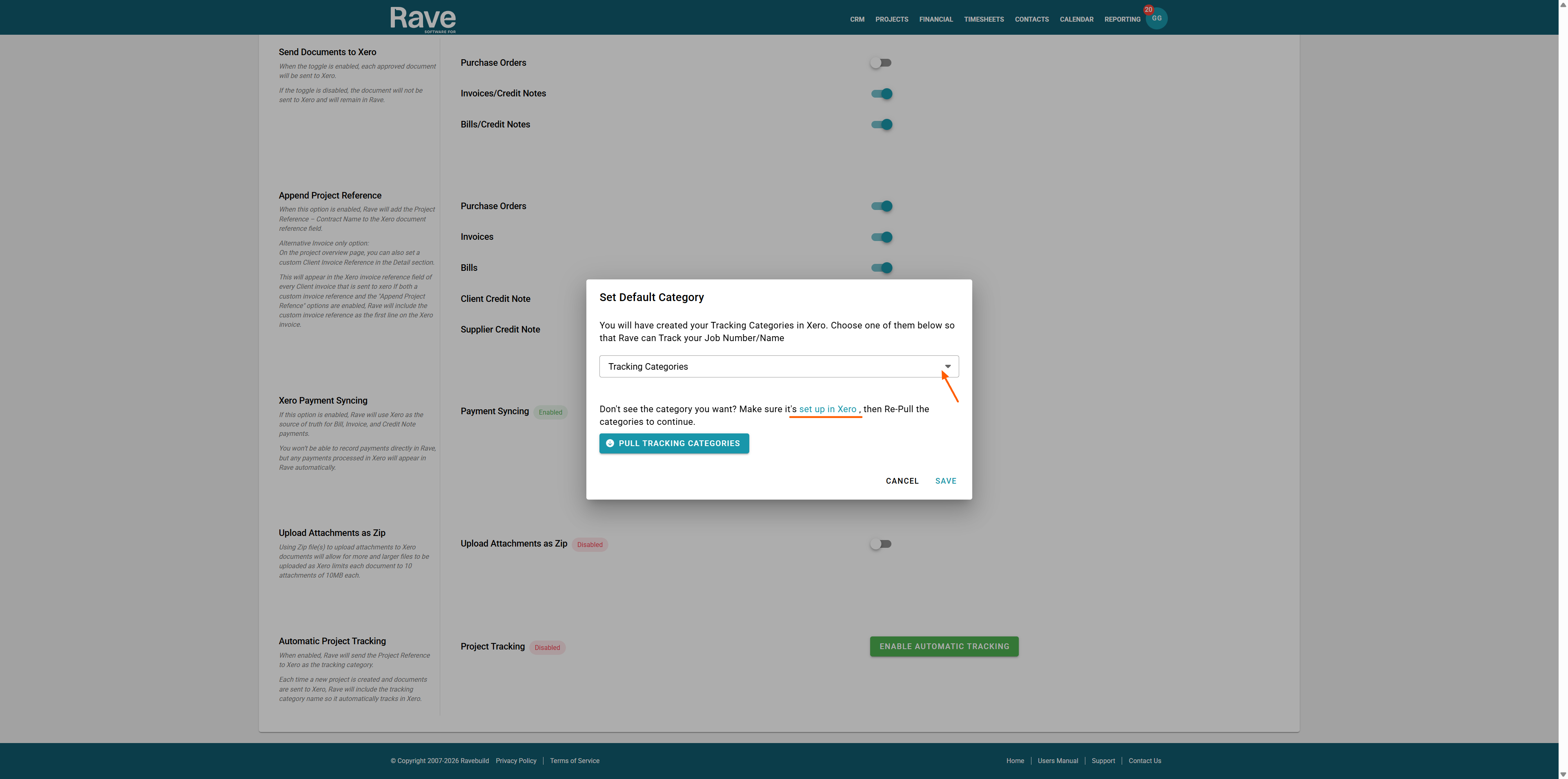 You can now select the correct tracking category from the drop-down to match an existing Xero category to the Rave Project. Or you can leave the box blank, and Rave will automatically create a new tracking category for each project when you send your first document to Xero.