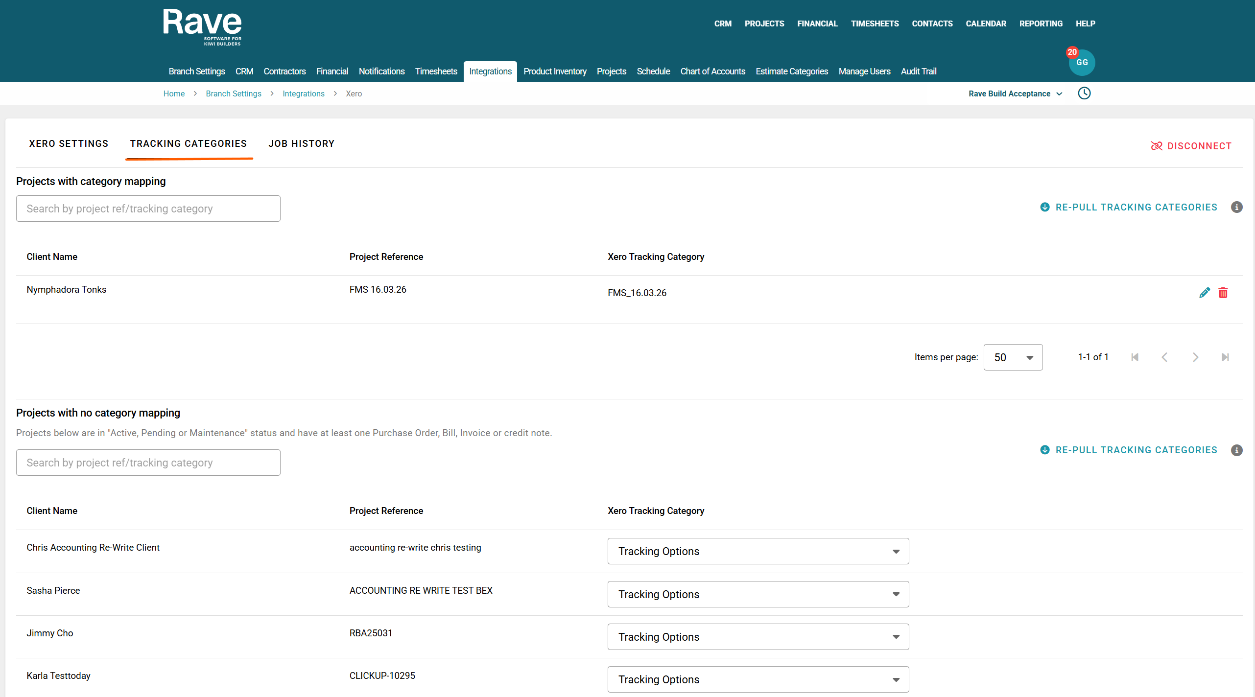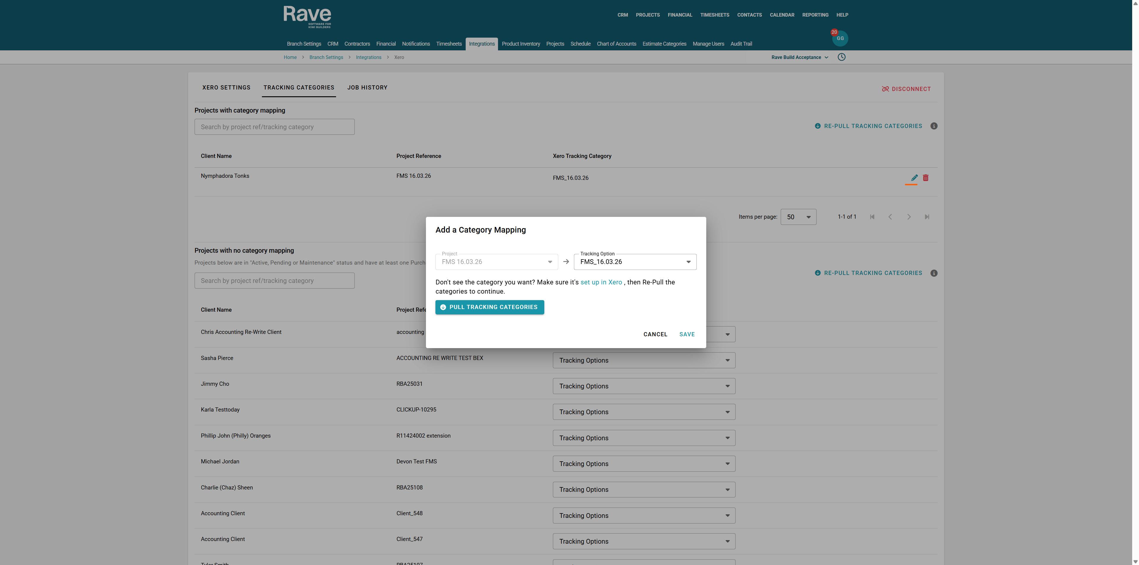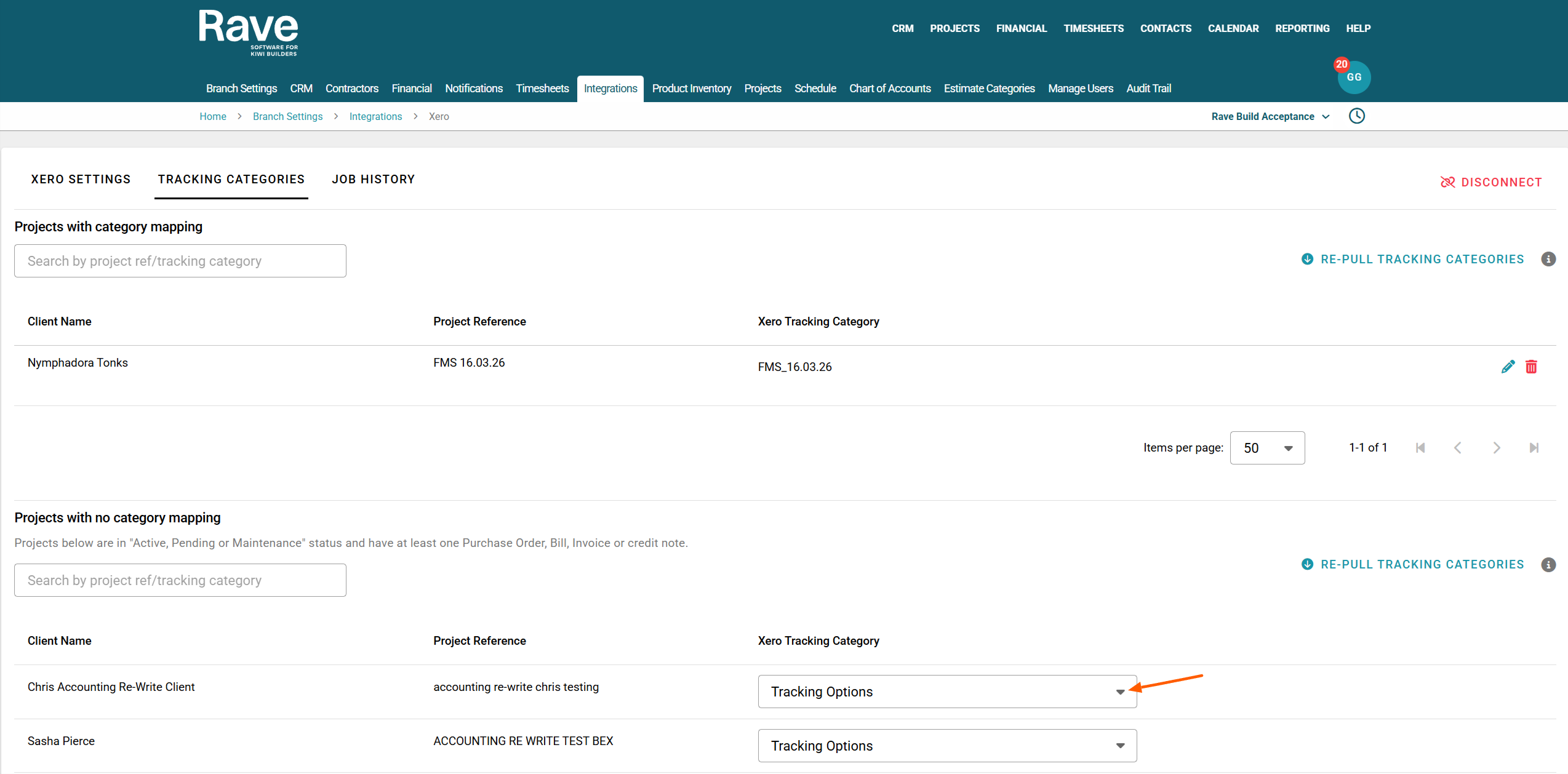 The second Box is titled "Projects with No Category Mapping". I.e., all projects in Rave that have at least one financial document in Xero and are mapped to a Xero Tracking Category.