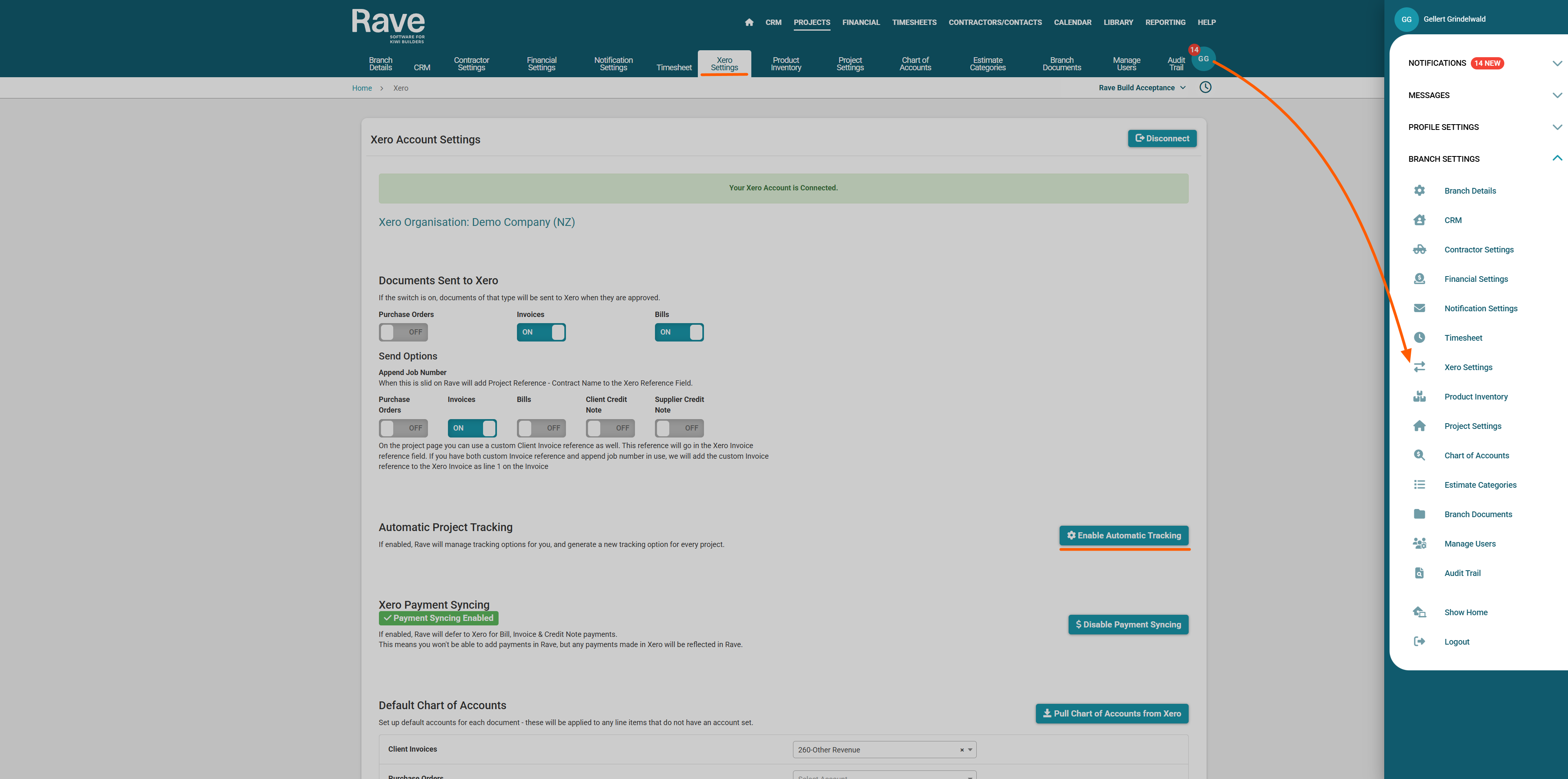 To set up RAVE's Xero Project Tracking, you first need to log into your branch's Xero account, and make some changes, before returning to RAVE to complete the process. Instructions for how to do both are listed below.