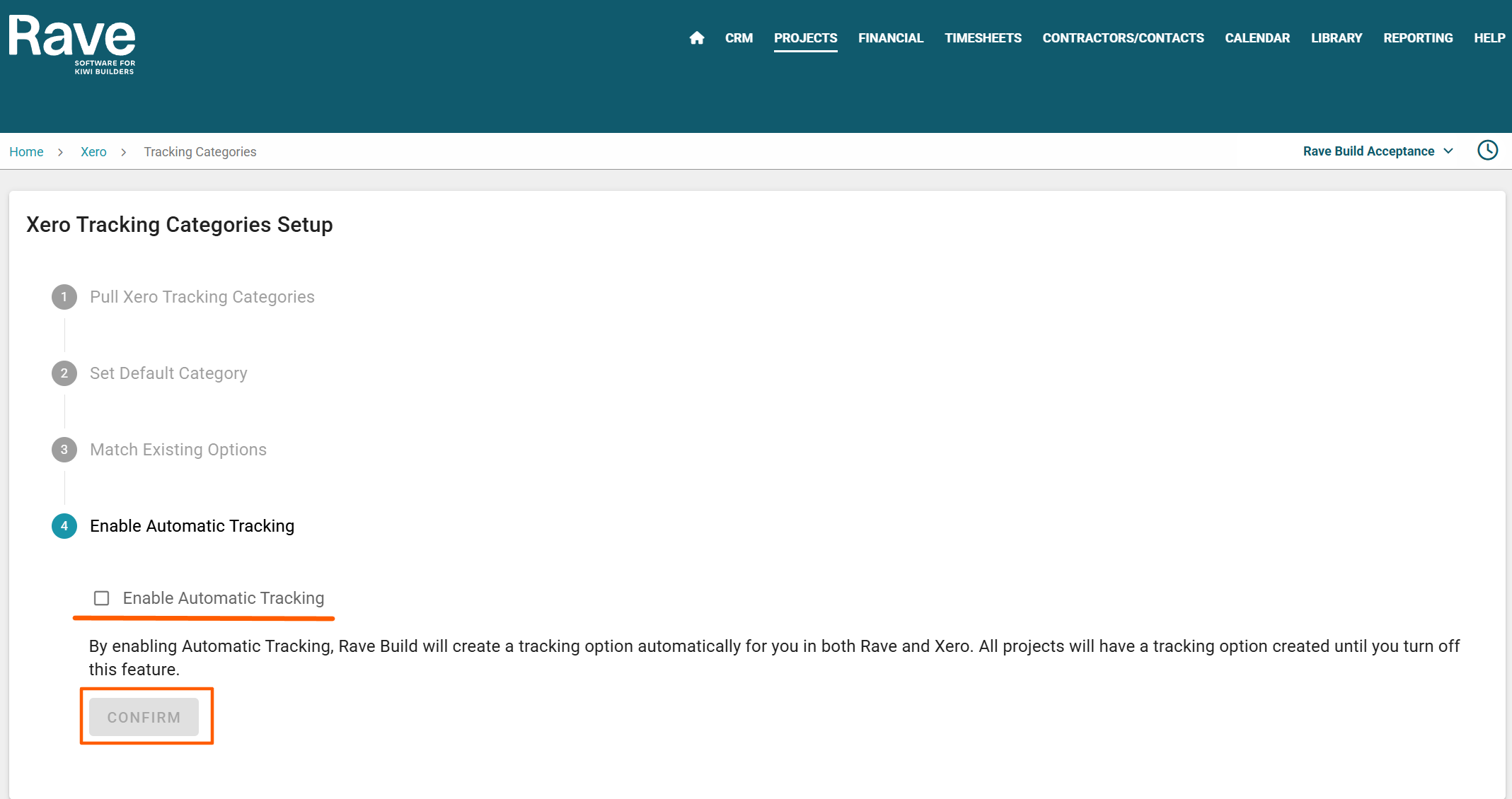 NOTE: If you have not already connected RAVE to Xero, using the 'Connect to Xero' button. You can find more information for connecting RAVE to Xero in our article here. - From your RAVE's Xero page, click the 'Enable Automatic Tracking' button to complete the project tracking setup.