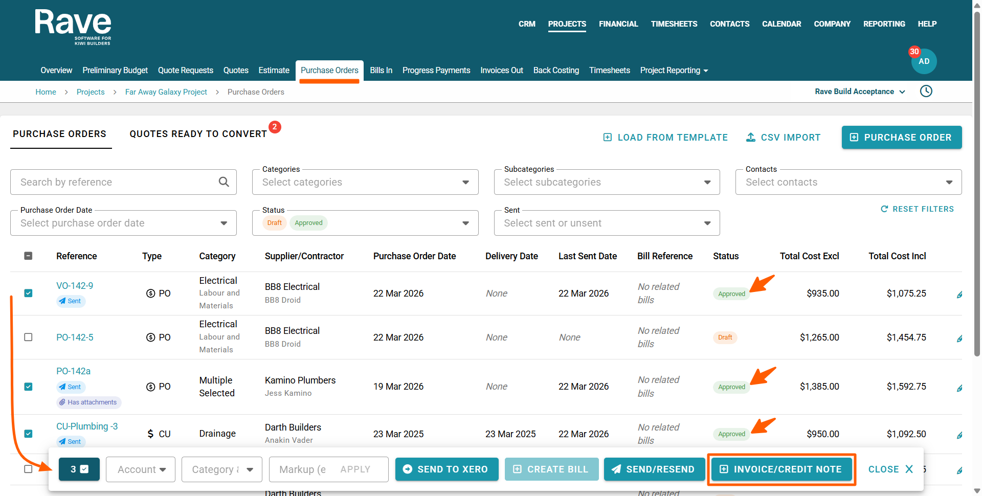 This will open the bulk action bar, displaying the number of purchase orders selected (to the left), with a teal-coloured '+ Invoice/Credit Note' button to the right.