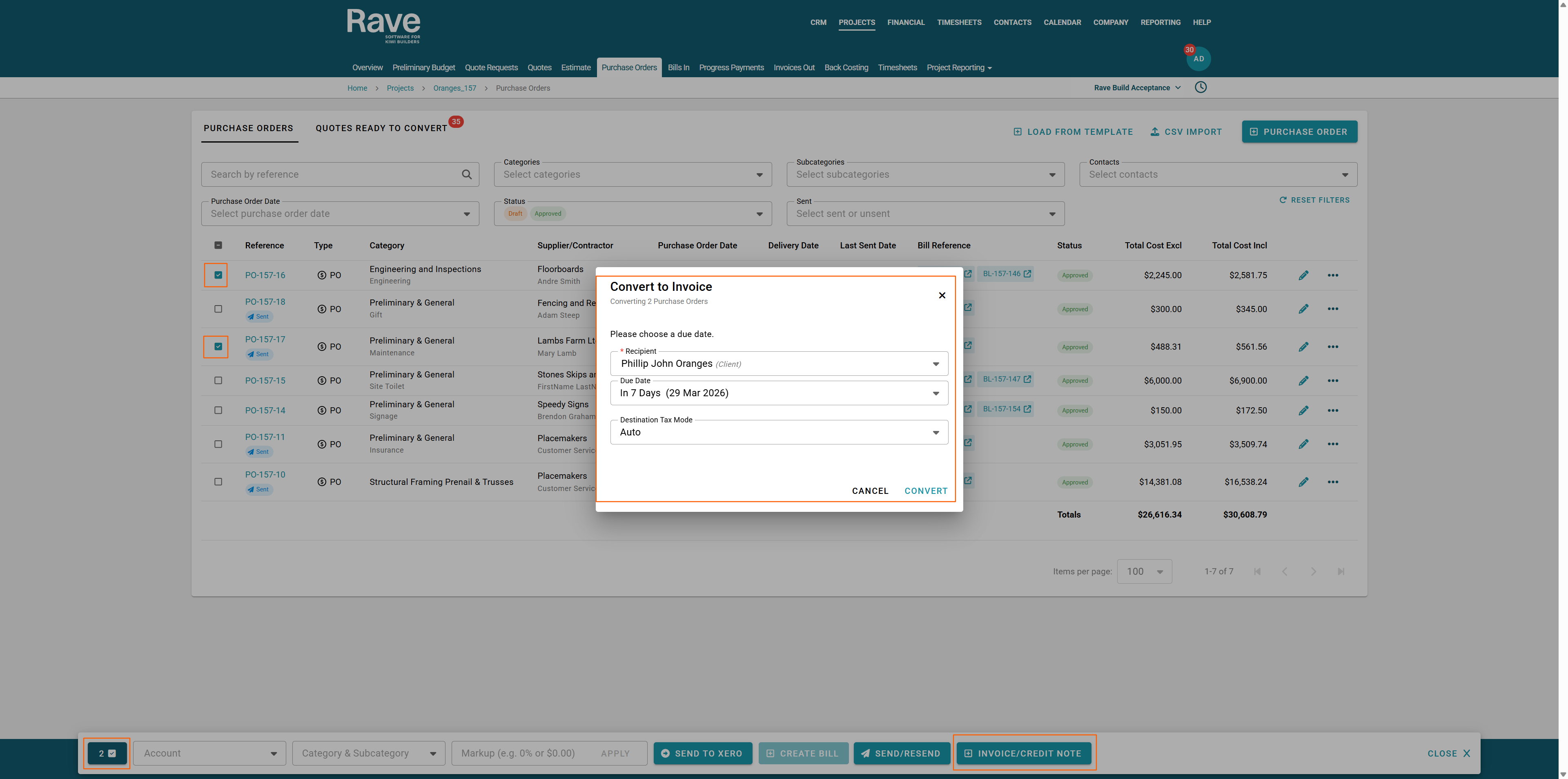 Note: You can apply an 'approved' status filter on this page to only display approved purchase orders for selection. - Clicking on the '+ Invoice/Credit Note' button opens a 'Convert to Invoice' pop-up where you can confirm: