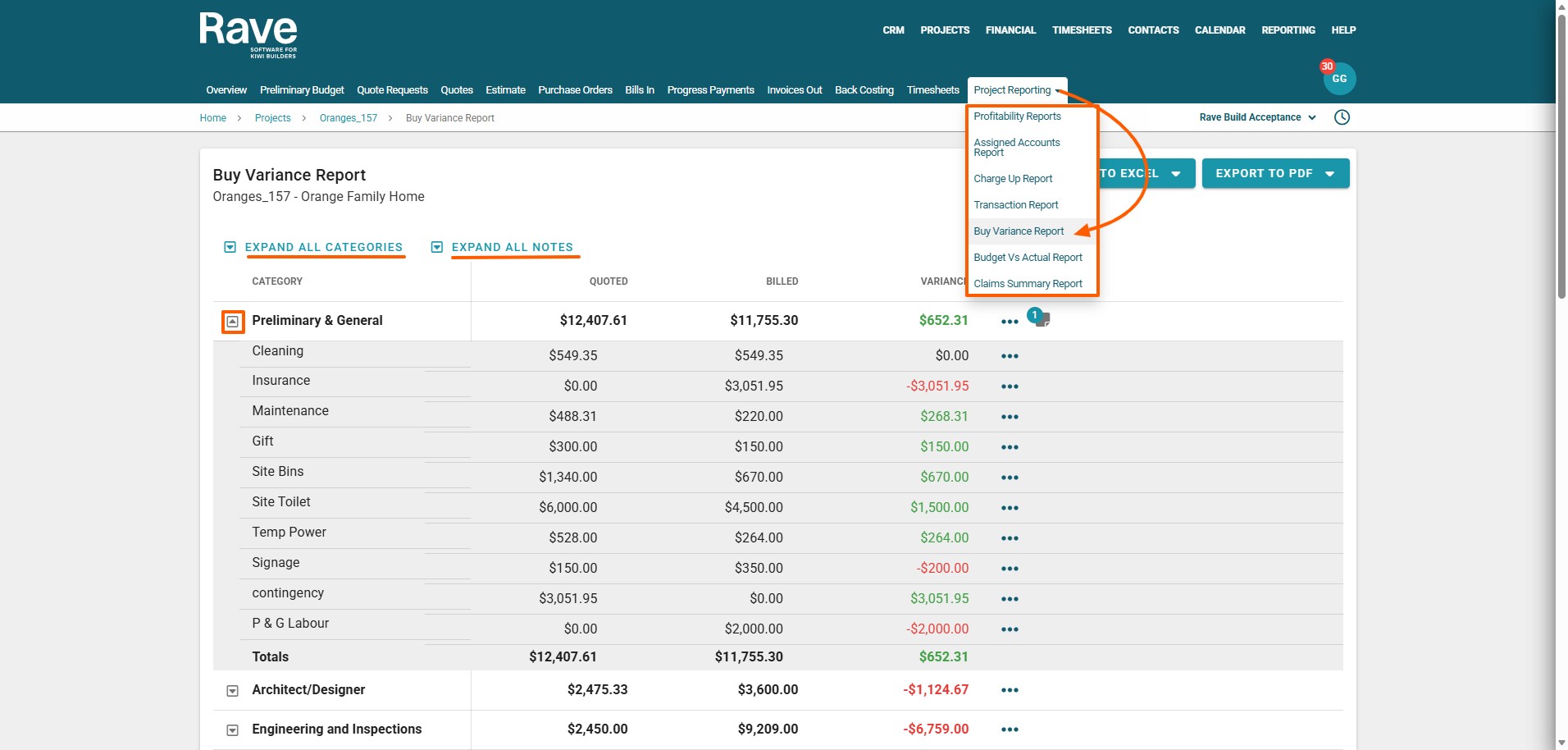 The RAVE Financial Management System's new 'Buy Variance Report' allows you to compare your quotes vs. bills by Category and Sub-category level for a more granular back-costing view. You'll find the 'Buy Variance Report' via your project's Budget sub-tab under the Project Reporting dropdown.