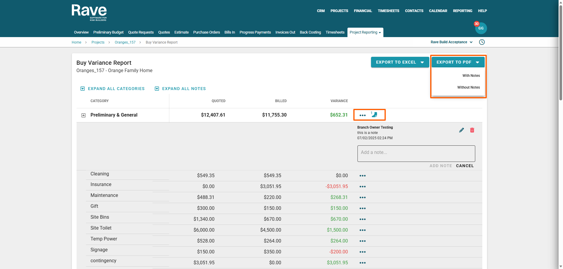 Rave's handy colour coding of the Variance column displays: