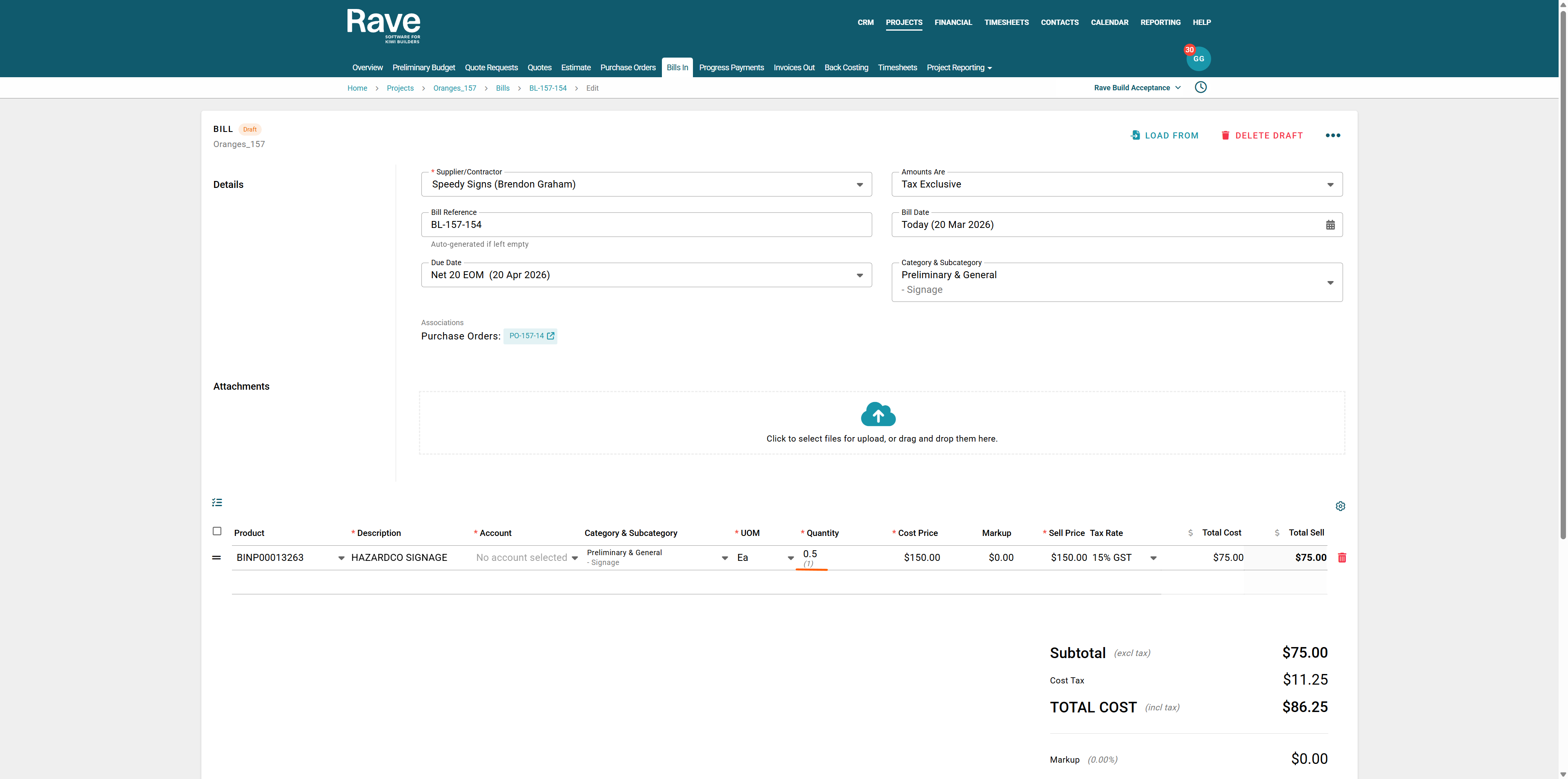 You can access your Project’s financial workflows from either the Financial button or the Project button's Project list, clicking on the project’s reference number, and finally selecting the Budget sub-tab, then Bills.