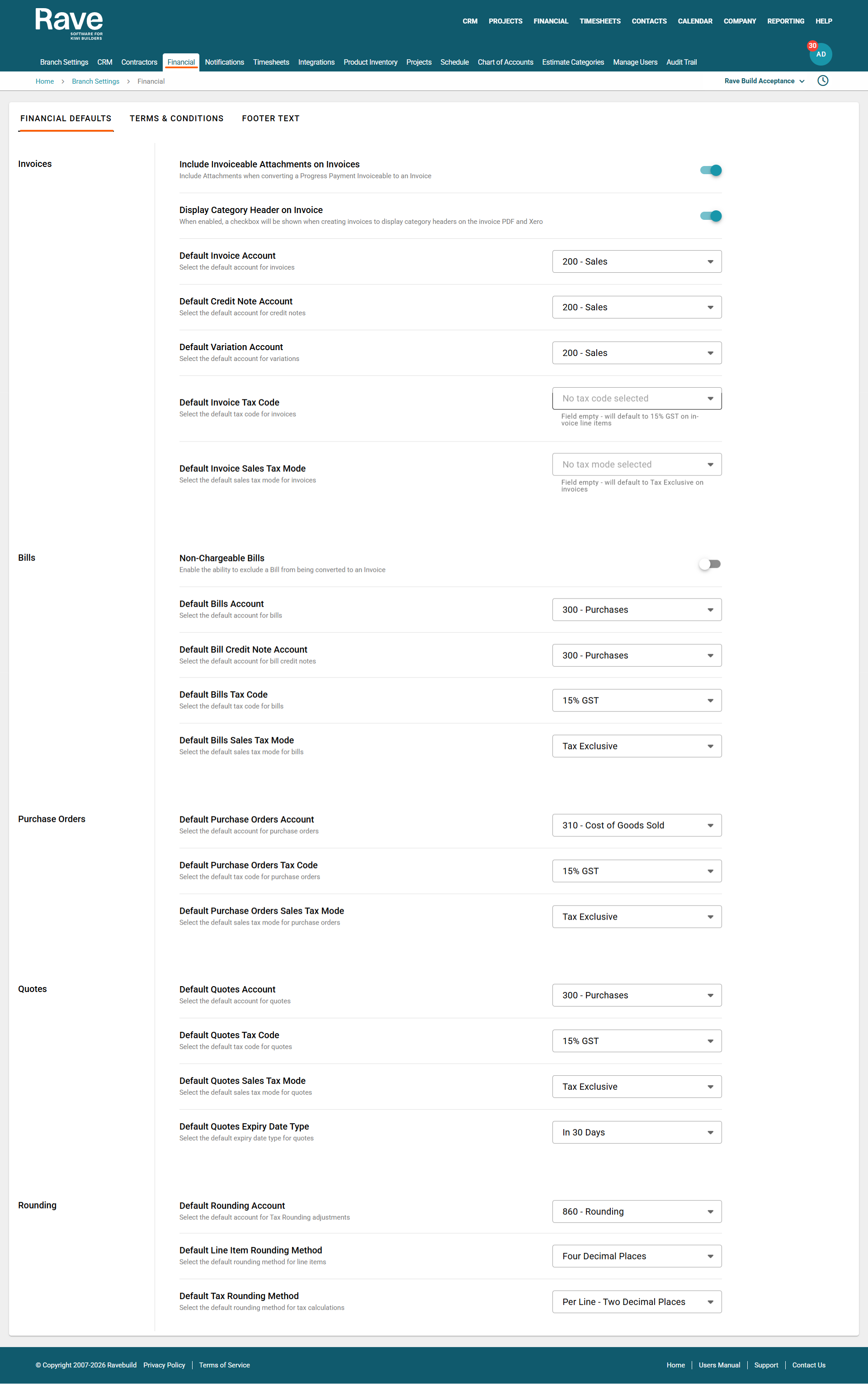 When creating a financial document in Rave, you can set the default tax type for each document type. The choice is No GST, 15% GST, Tax on Imports and Zero Rated