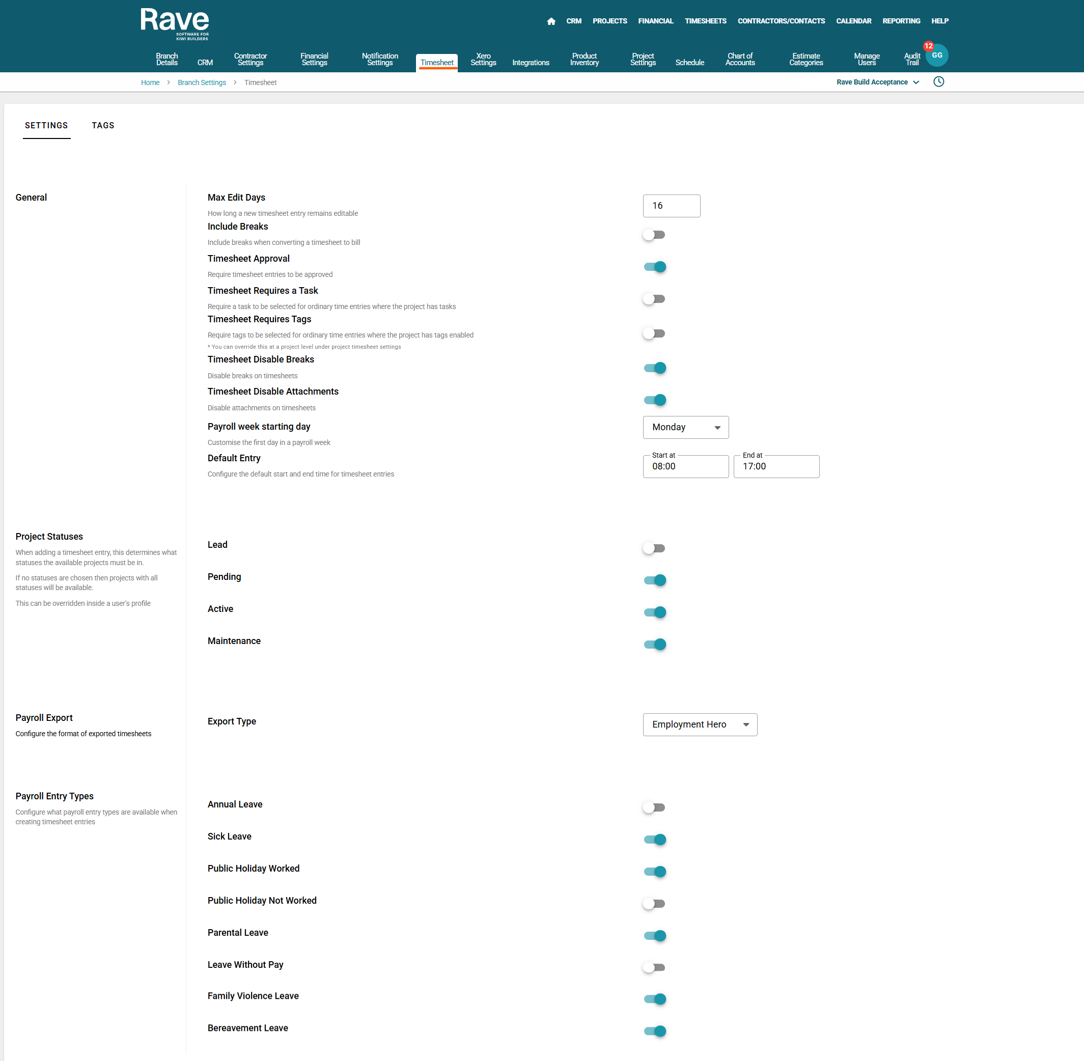 You will now see the Timesheet Options for Branch Settings and Timesheet Tags - from here you can edit the following: