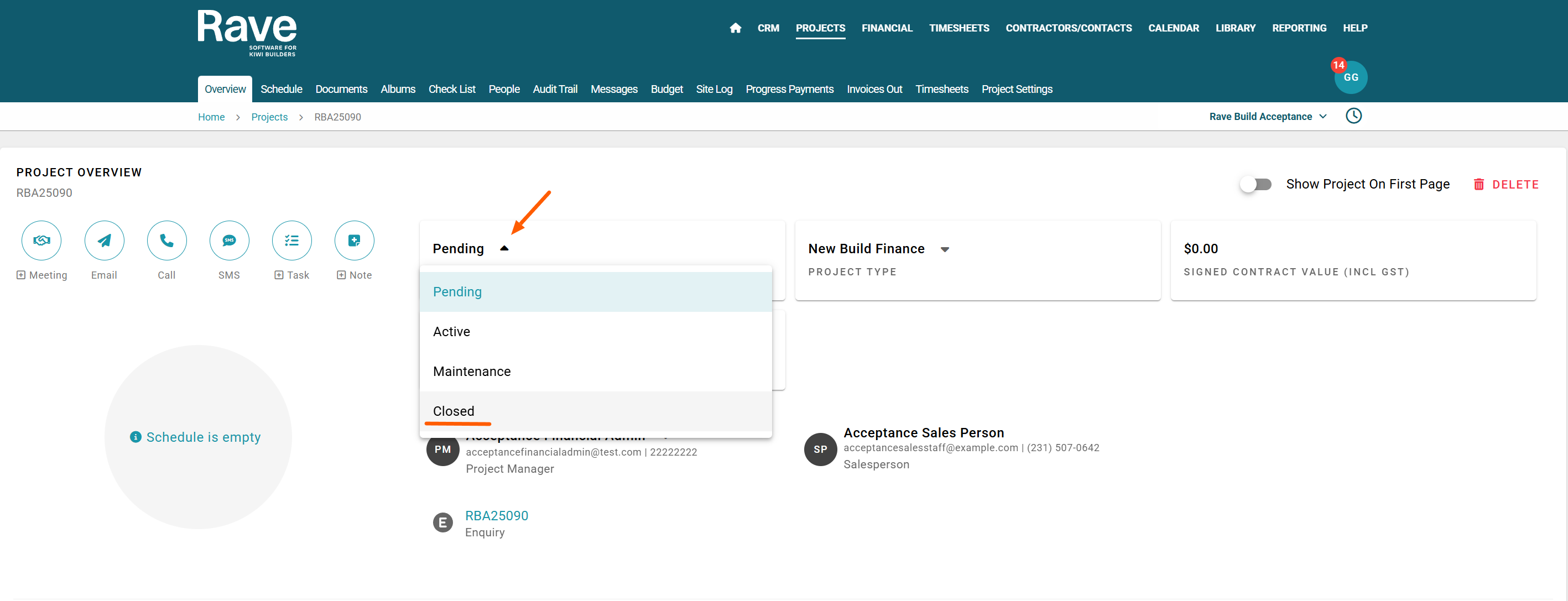If you accidentally mark a build as closed, you can easily make the build active again by clicking on the Project Name and then click on the toggle to Reactivate the Project. Your build till now be active again and can be found under Projects Tab. From here you can edit the Enquiry details and project details if need be.