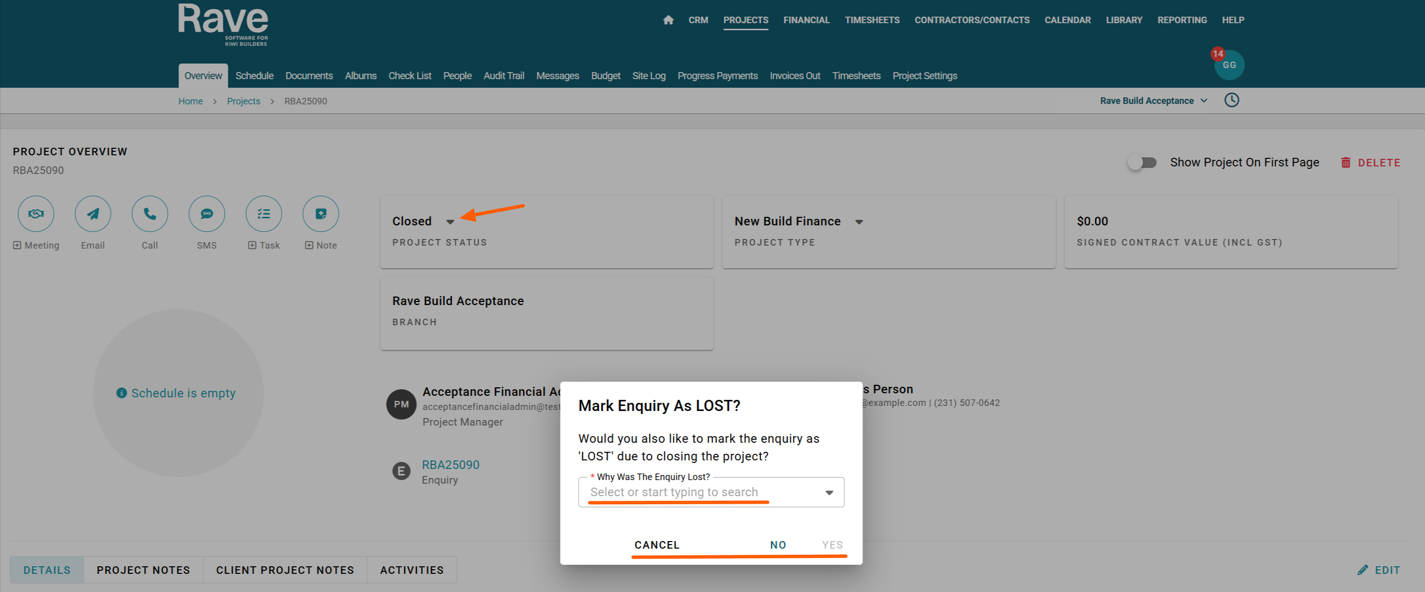 If the enquiry linked to this project was not Won, a popup will ask if you want to mark the enquiry as Lost. It's recommended to complete this step and choose a lost reason so it’s removed from active leads.