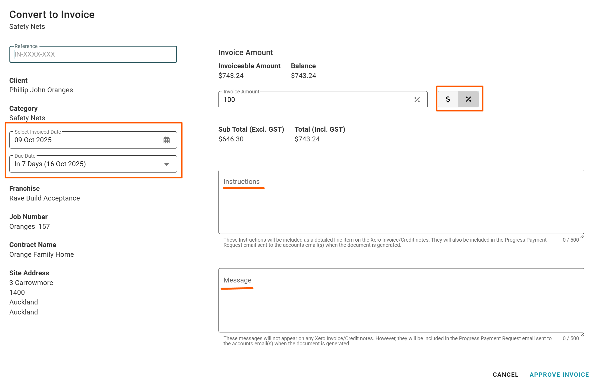 - Select your total invoice amount by dollar value or percentage (if you are only wanting to partially invoice the client)